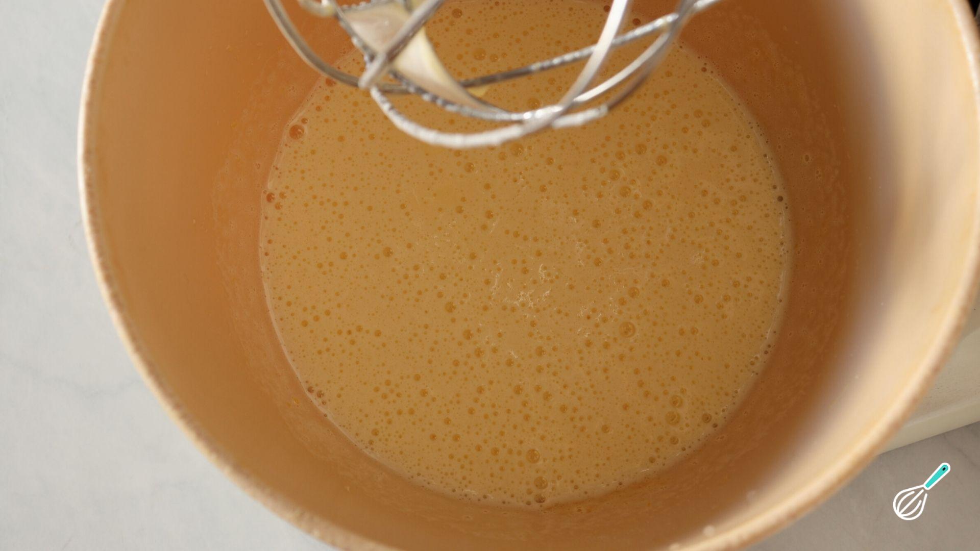 Logo em seguida deixe a batedeira na velocidade mais baixa e vá adicionando aos poucos o leite quente com a manteiga.