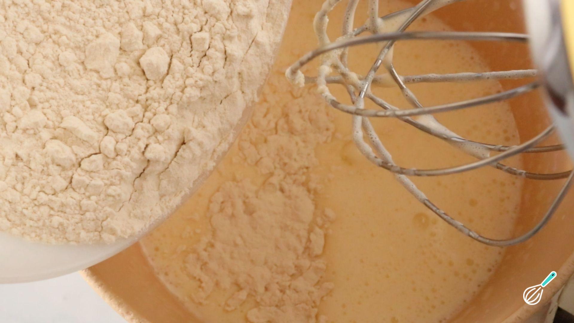 Agora acrescente a farinha de trigo, também aos poucos, e continue batendo em velocidade baixa.