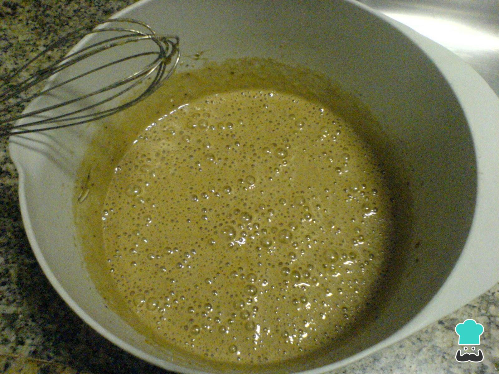 Comece por bater os ovos com o açúcar mascavo até obter uma gemada fofa.