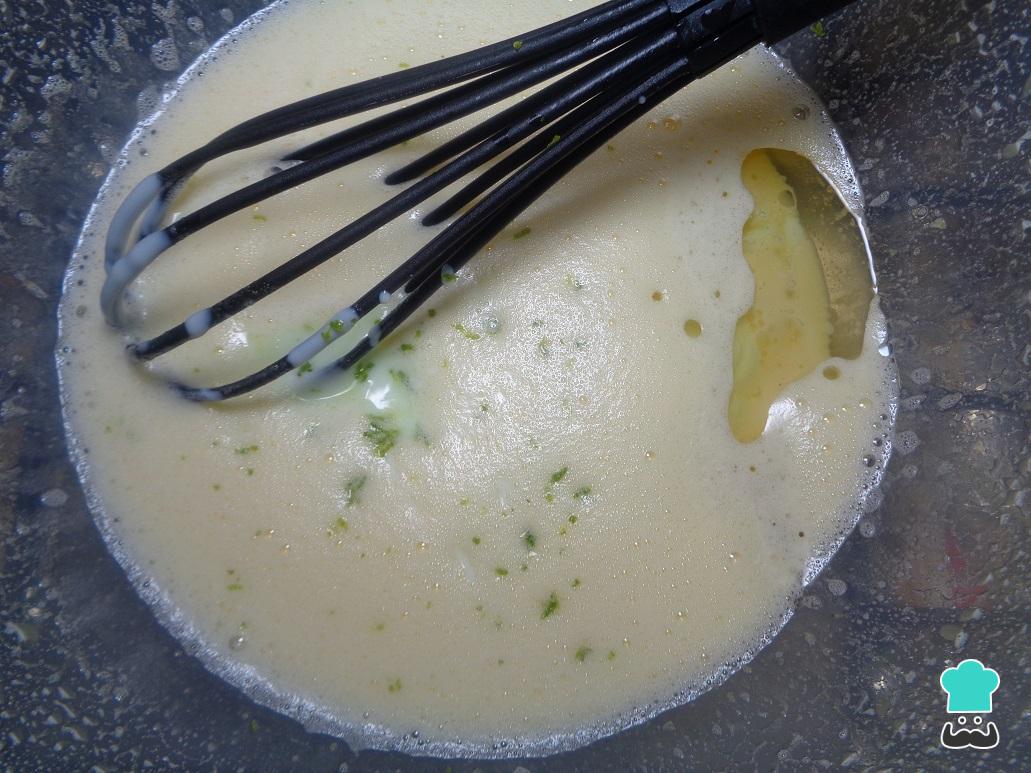 Uma vez bem integrados os primeiros ingredientes, adicione o iogurte, as raspas de limão e o óleo. Em seguida, com a ajuda de um fouet ou de uma batedeira, volte a integrar tudo perfeitamente.