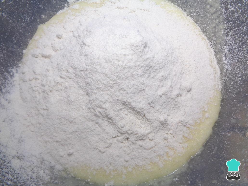 Em seguida, adicione a farinha e o fermento em pó previamente peneirados.