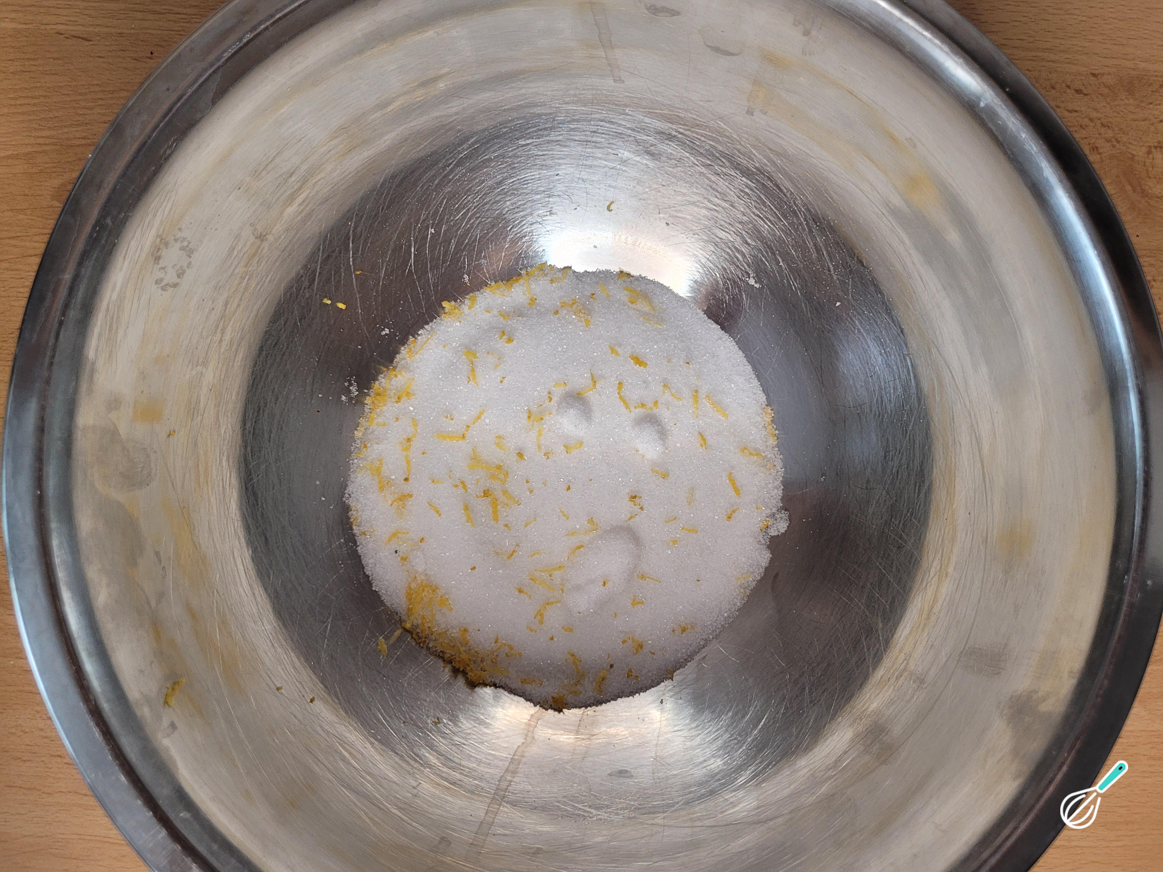 Misture o açúcar com as raspas de limão, tomando muito cuidado para não pegar a parte branca do limão, que pode amargar a receita.