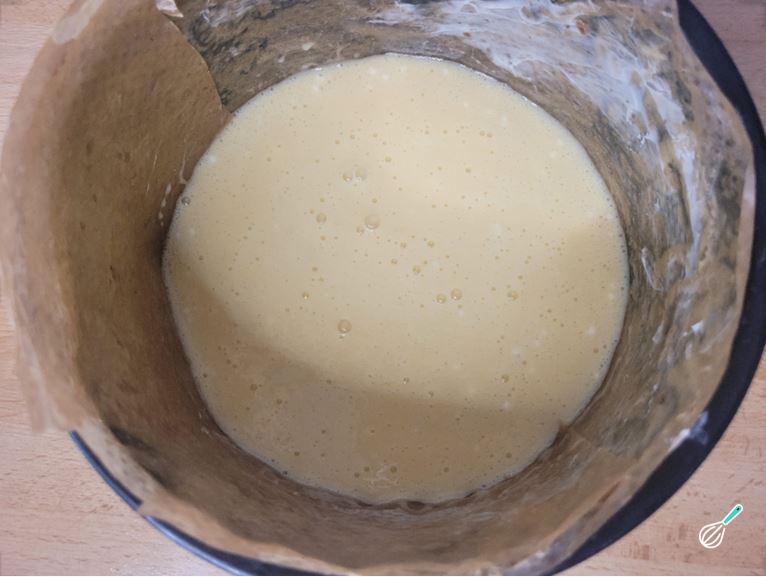 Coloque em uma forma untada com papel manteiga (usei uma de fundo removível) e leve para o forno preaquecido a 180°C fazendo o teste com uma faca ou palito para ver quando o bolo estará pronto.
