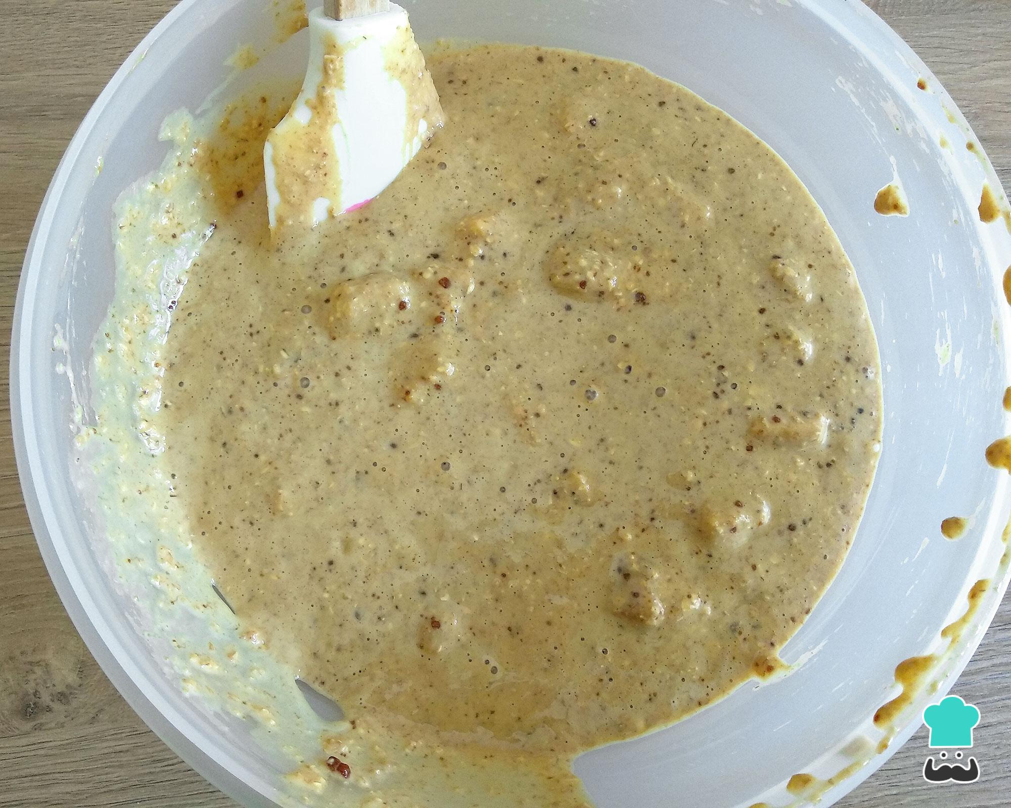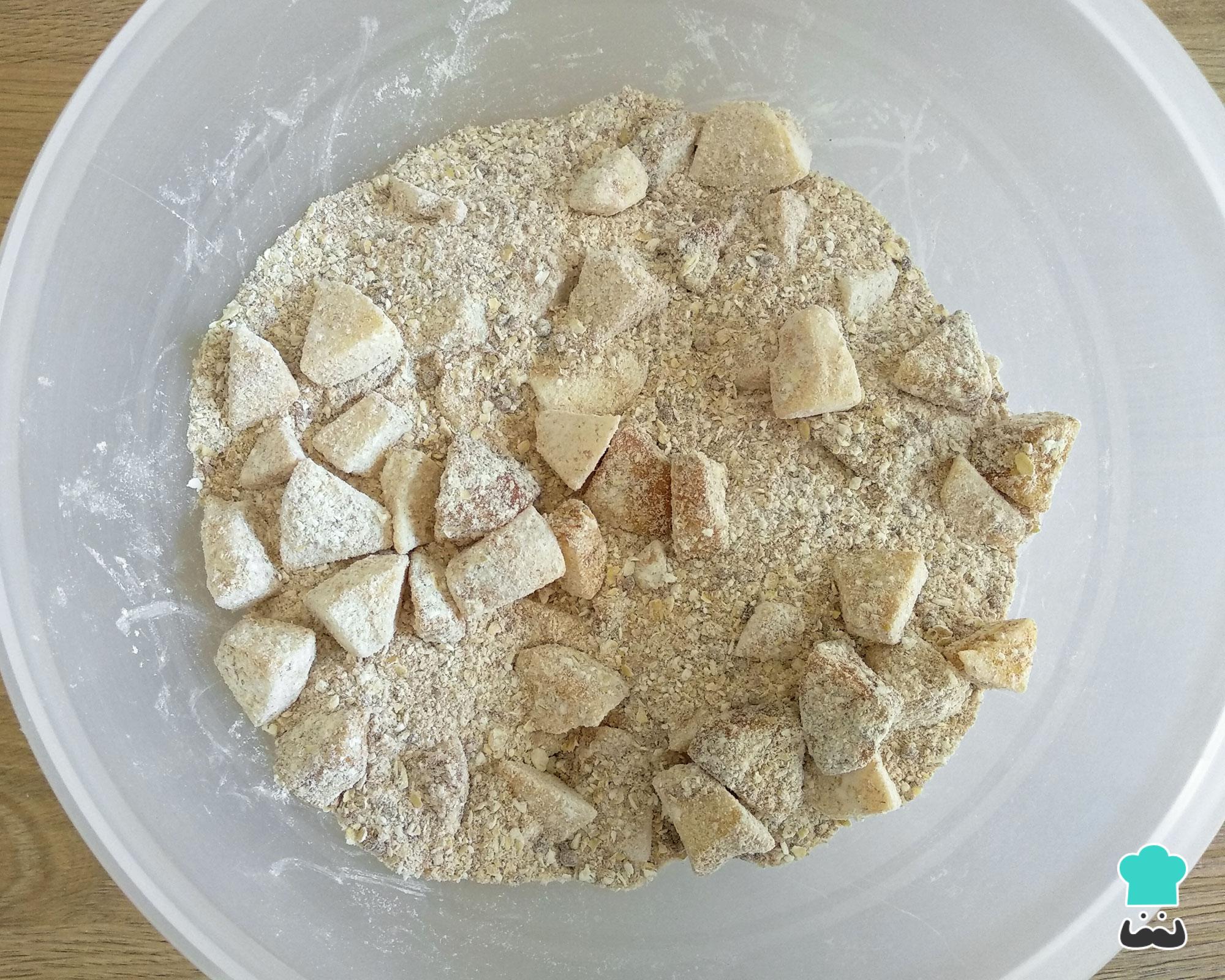 Adicione a mistura do liquidificador na tigela e envolva tudo muito bem com uma espátula ou batedor. Neste momento, se quiser, poderá adicionar alguns ingredientes extra na massa deste bolo integral de maçã e aveia: