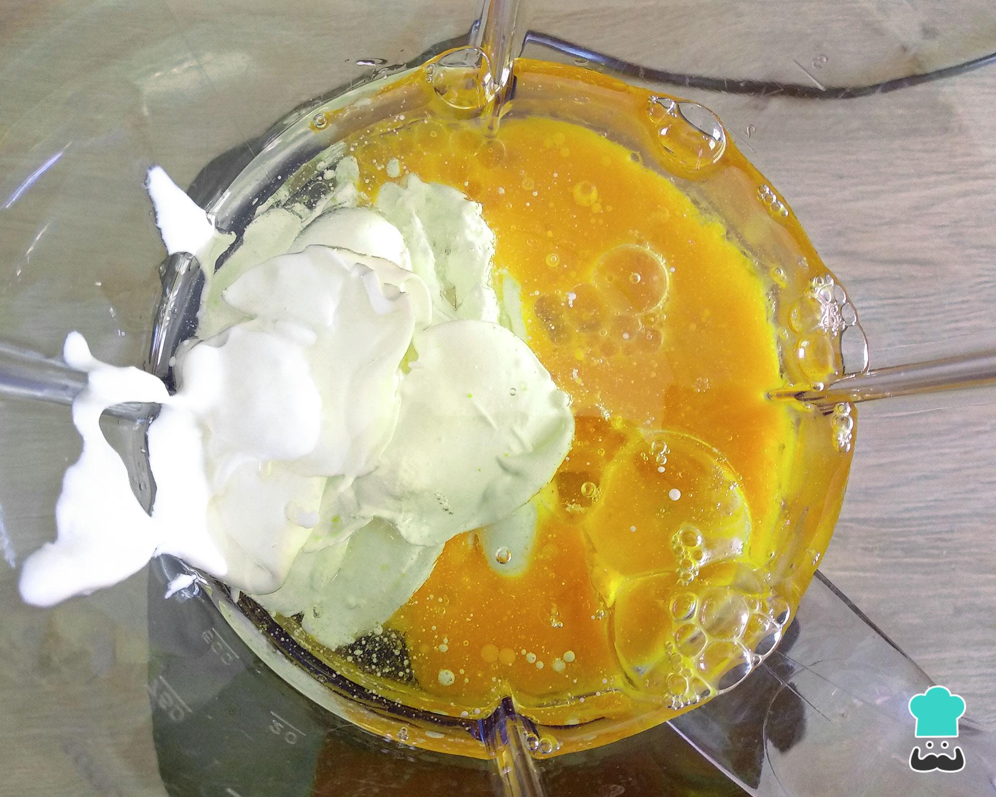 No liquidificador bata os ovos, o óleo e o iogurte por 1-2 minutos, até espumar bem. Isso é importante para incorporar ar nesses ingredientes e, assim, conseguir um bolo mais crescido e fofinho!