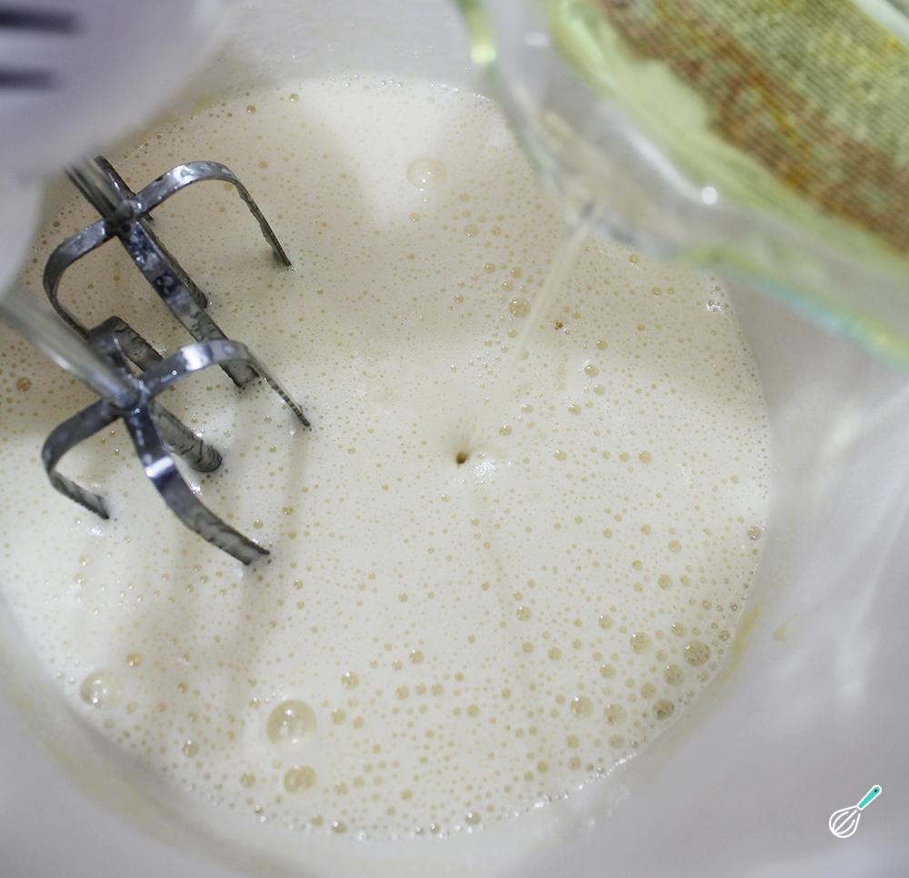 Em outra tigela limpa, bata os ovos com o açúcar até formar uma espuma. Em seguida, adicione o óleo em forma de fio, bem devagar, e continue batendo.