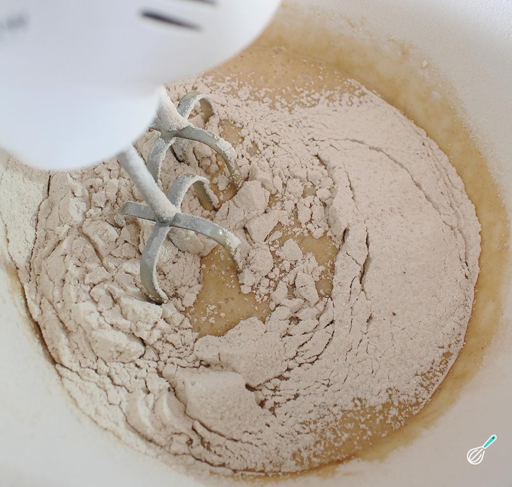 Adicione aos poucos os ingredientes secos da massa do bolo com maçã e passas e continue batendo em velocidade baixa.