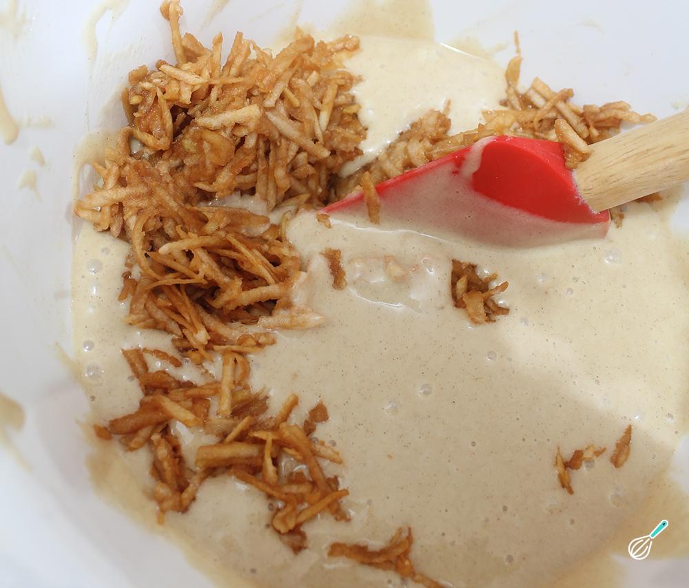 A seguir, ralamos as maçãs e adicionamos ao preparado fora da batedeira. Batemos até misturar bem.