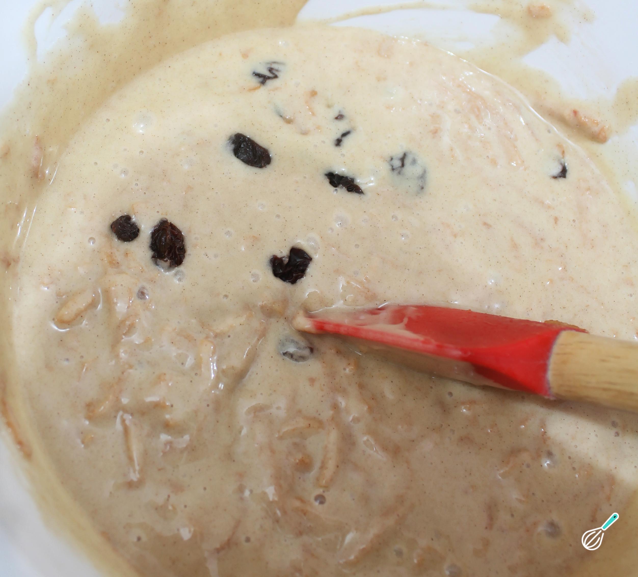 Em seguida, adicione as passas à massa fácil de bolo de maçã com uvas passas e mexa até que tudo esteja bem integrado.