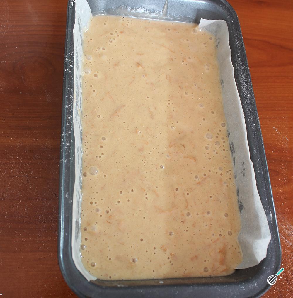 Por fim, unte com manteiga uma forma rectangular e forre com papel vegetal. Pegue o bolo de maçã e leve ao forno pré-aquecido a 180°C por aproximadamente 1 hora.