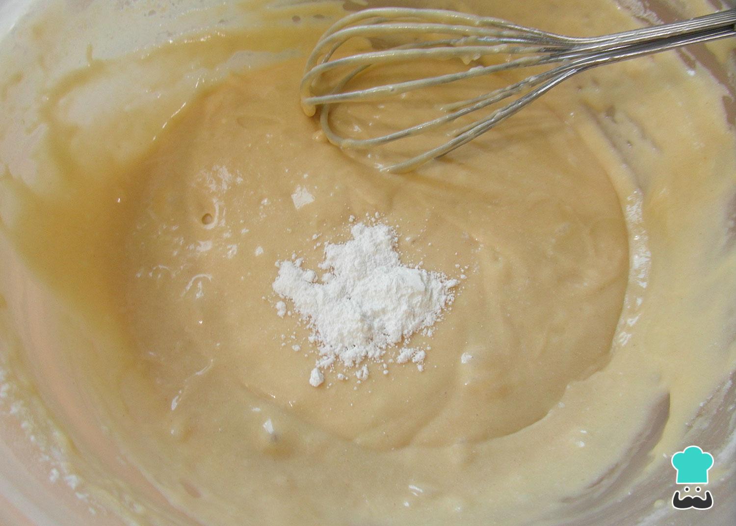 Junte numa só tigela a farinha e a maisena e peneire para a tigela onde está preparando a massa do bolo de maçã. Envolva muito bem e adicione o fermento em último lugar. Reserve.