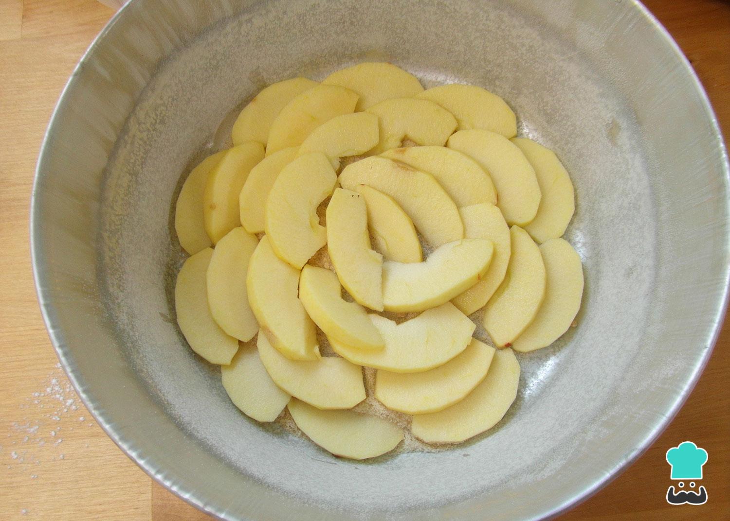 Unte e enfarinhe uma forma de bolo sem buraco e polvilhe 2 a 3 colheres de sopa de açúcar no fundo. Descasque as maçãs, corte metade delas em fatias e disponha no fundo da forma.