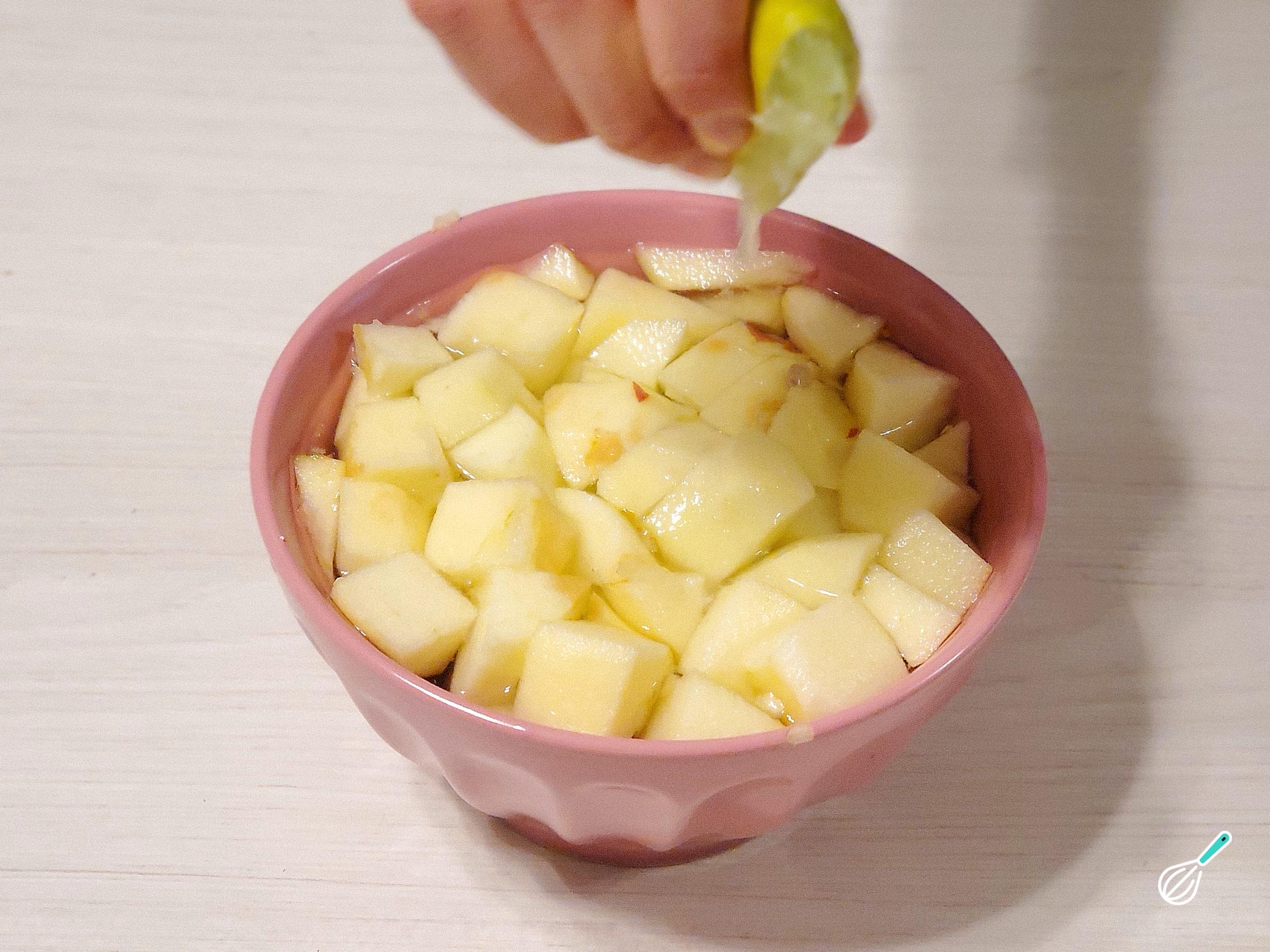Dica: coloque os cubos de maçã, recém cortados, em água com o suco de meio limão para evitar que escureçam enquanto você corta o restante das maçãs.