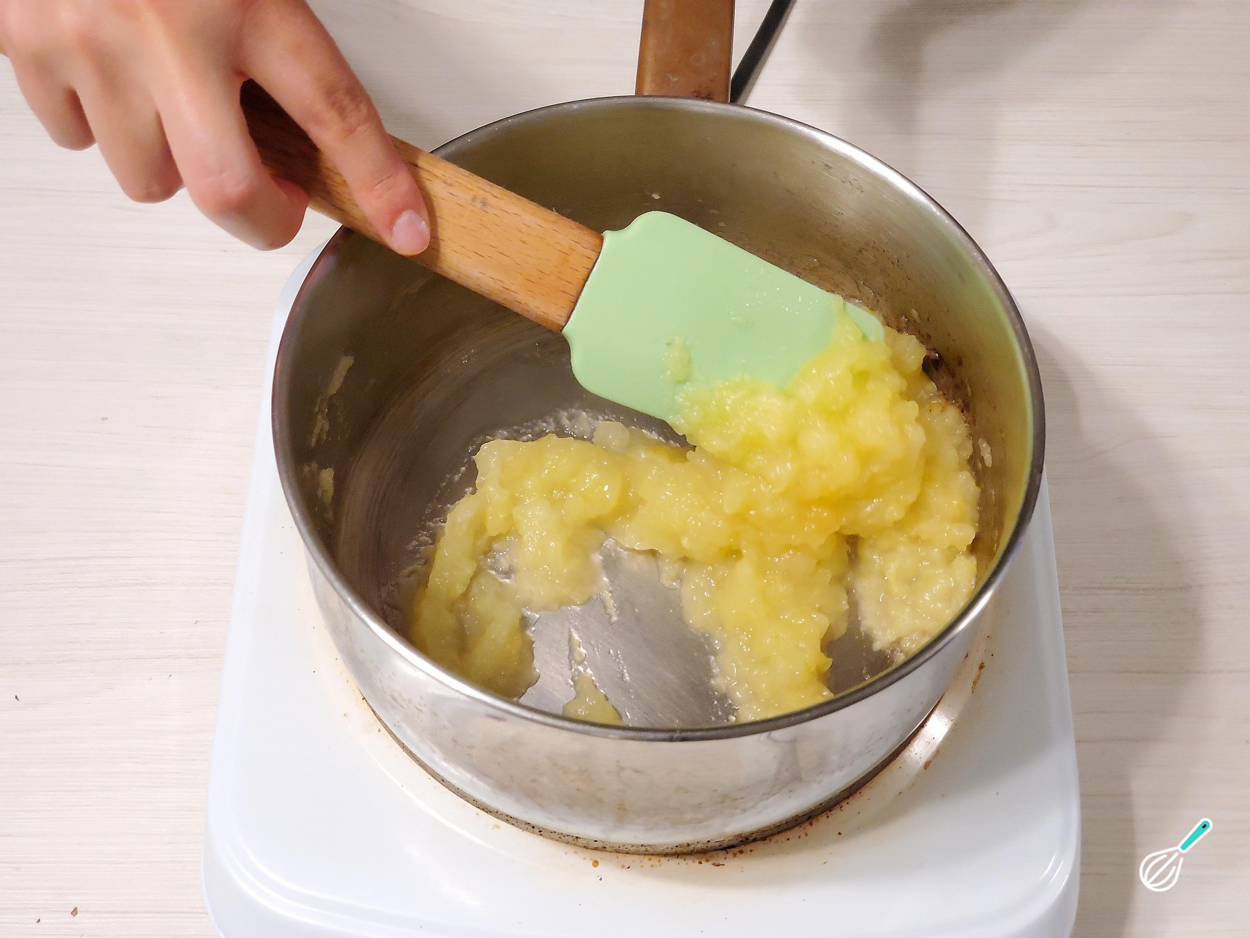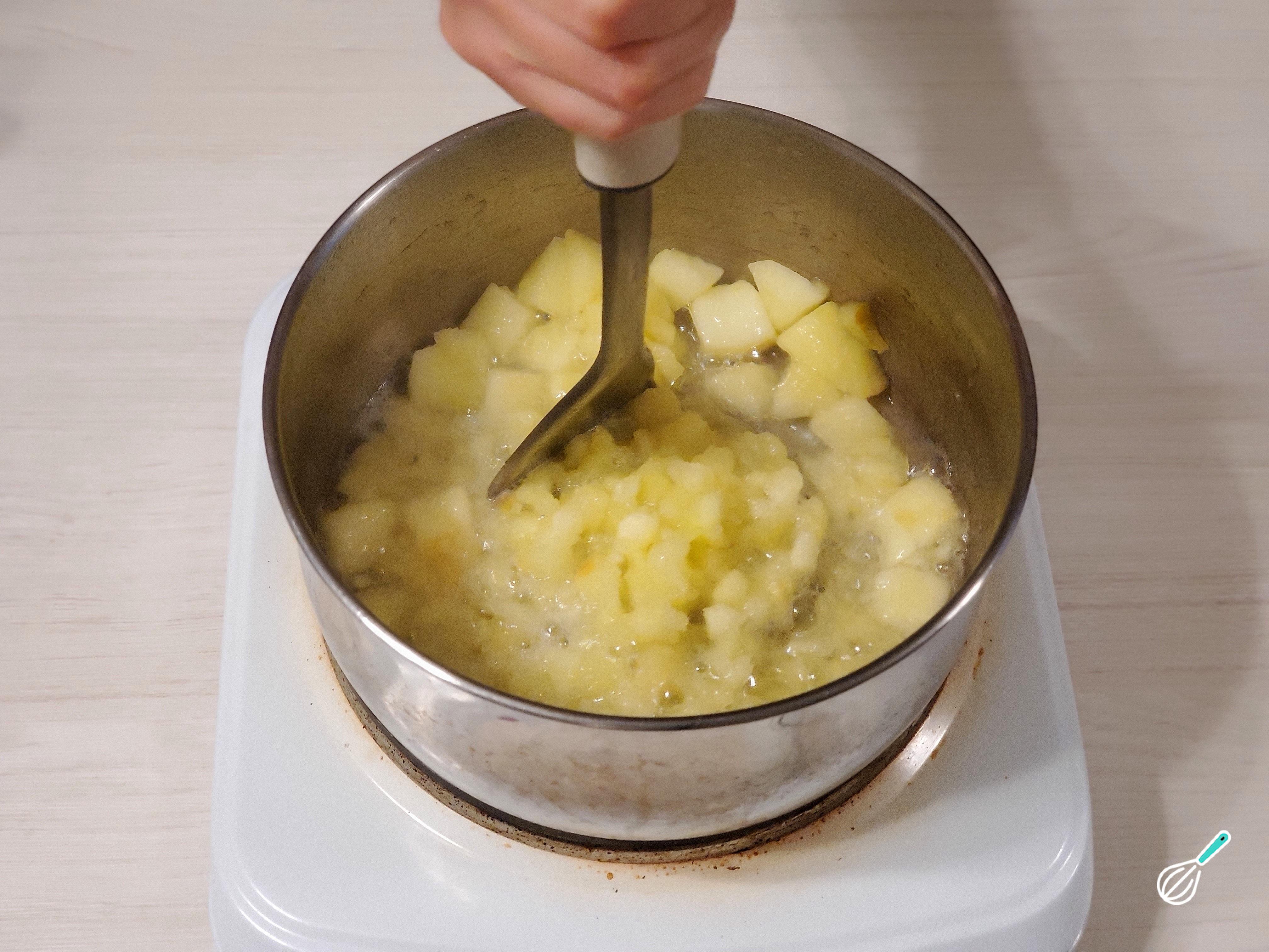 Coloque os cubos de maçã em uma panela média e despeje um fio de água. Ferva até a maçã amolecer e, em seguida, amasse as maçãs em um purê com um espremedor de batatas (não há problema se sobrarem alguns pedaços grandes). Vá mexendo de vez em quando e acrescente mais água se começar a secar.