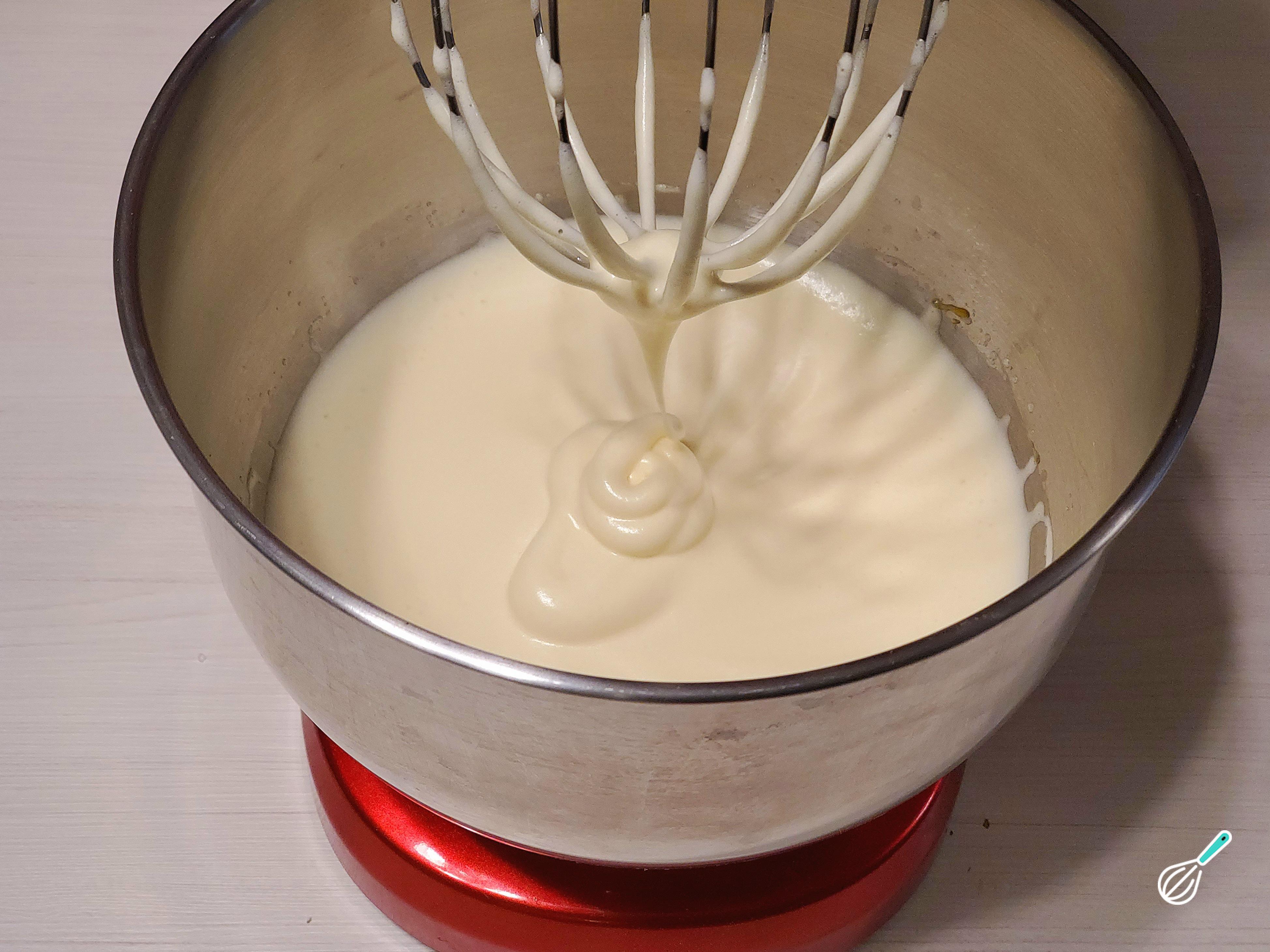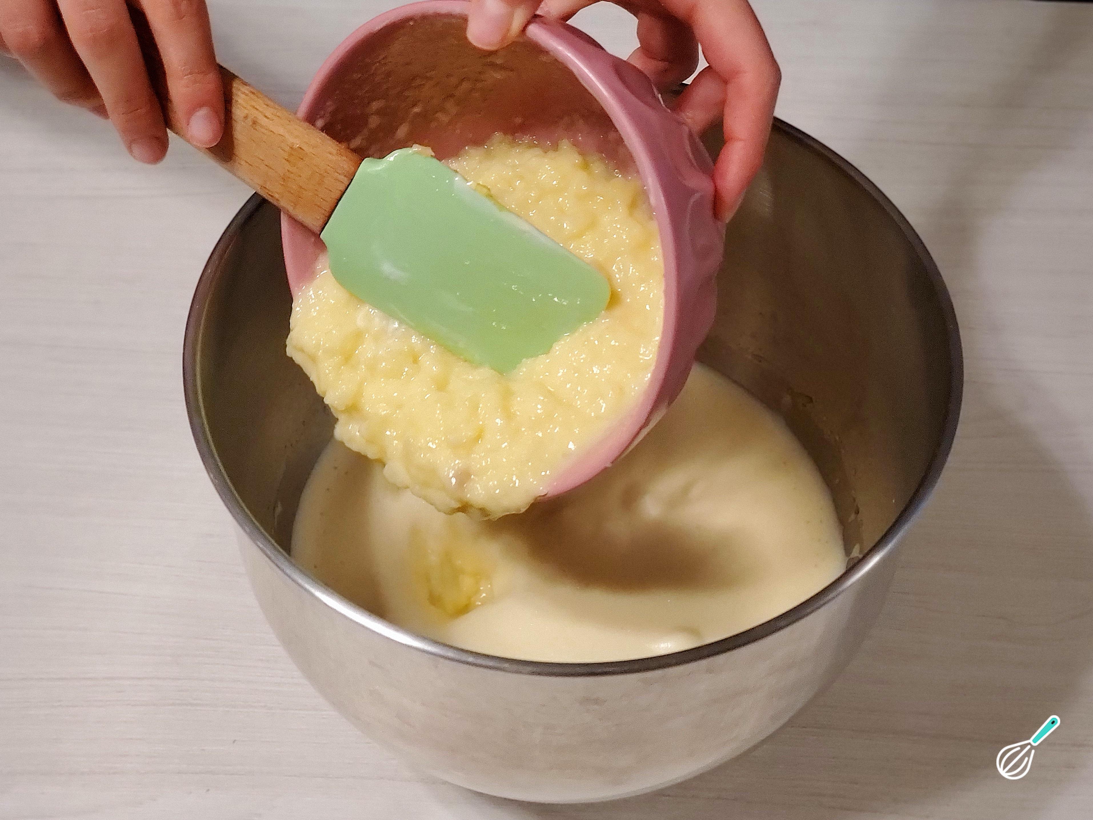 Quando a mistura de ovos estiver aerada, espessa, amarelada, quase esbranquiçada, e ao cair o rastro permanecer por alguns segundos, é hora de parar de bater e adicionar a tigela de iogurte e purê de maçã. Misture de forma envolvente com o auxílio de uma espátula de borracha.