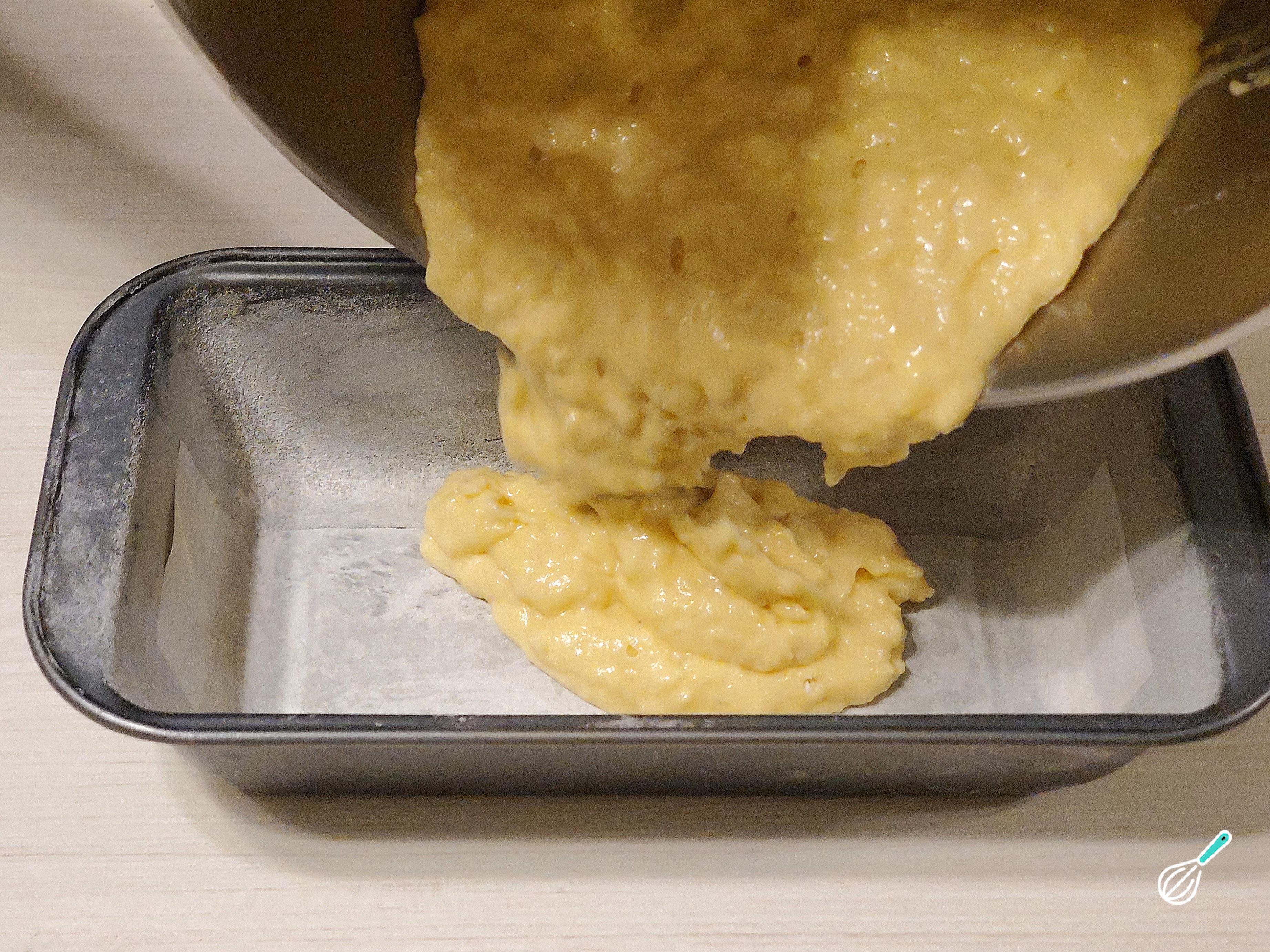 Despeje a massa em uma forma retangular de 22cm x 6cm previamente untada com manteiga, com uma folha de papel manteiga no fundo e enfarinhada. Espalhe bem com a ajuda de uma espátula.