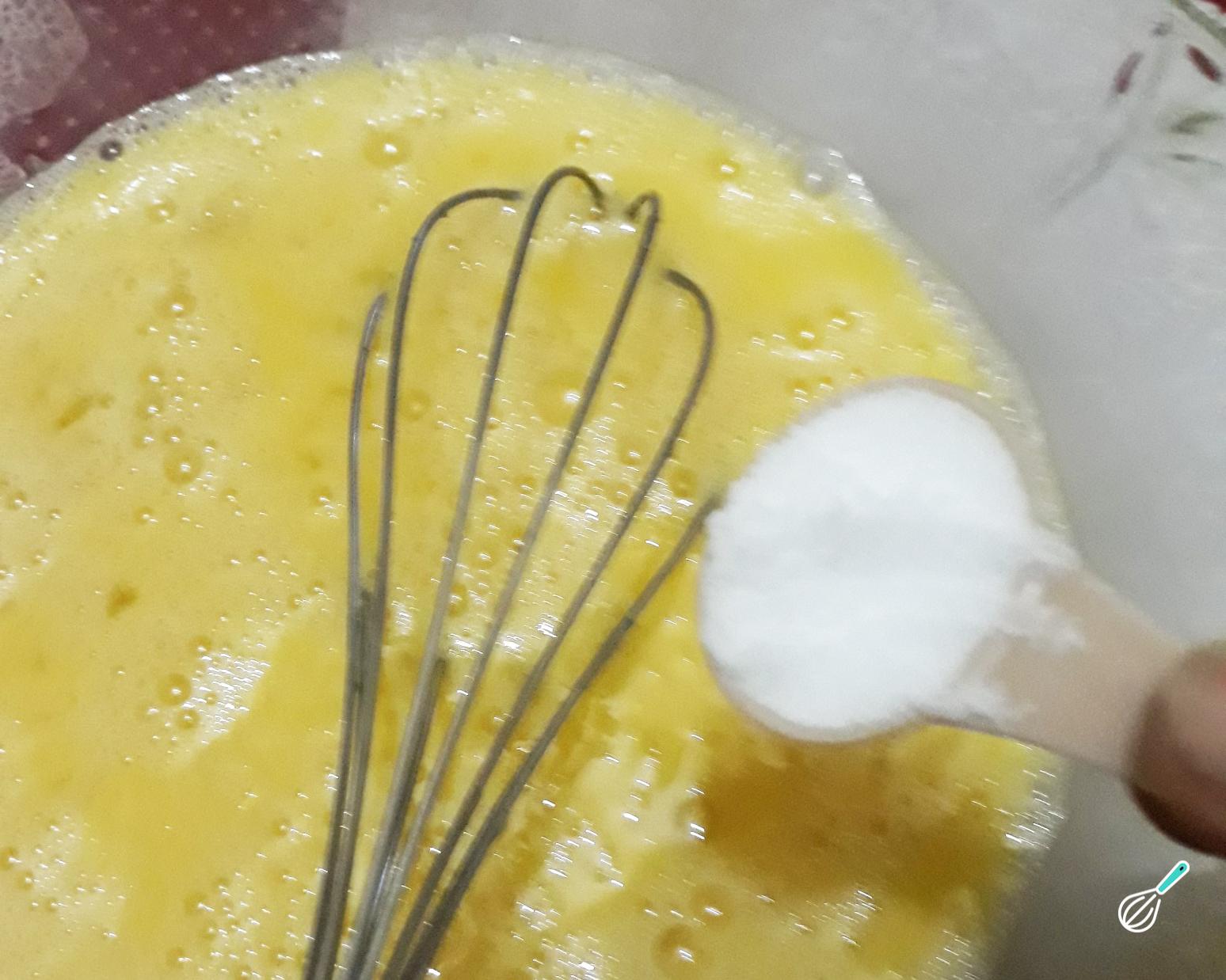 Em um bowl coloque os ovos e, com o auxílio de um fouet, bata até espumar. Adicione o açúcar e a margarina, continue batendo, acrescente a essência de baunilha e o sal e volte a bater para misturar.