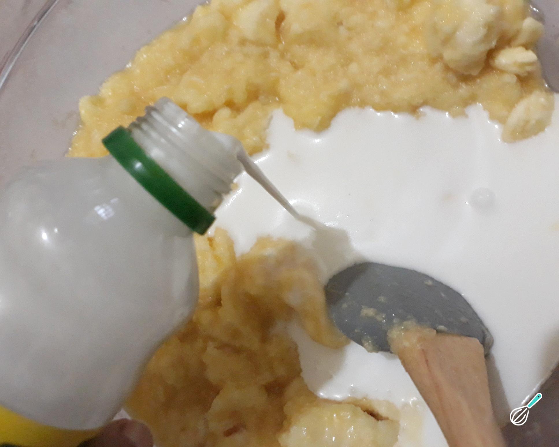 Junte a massa da mandioca, misturando sempre, acrescente o leite de coco e volte a misturar. Por fim junte o fermento e bata por uma última vez.
