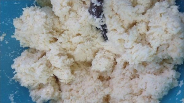 Seguidamente adicione a mandioca crua ralada e o coco ralado na mistura anterior e mexa até incorporar. Acrescente o fermento peneirado e mexa levemente.