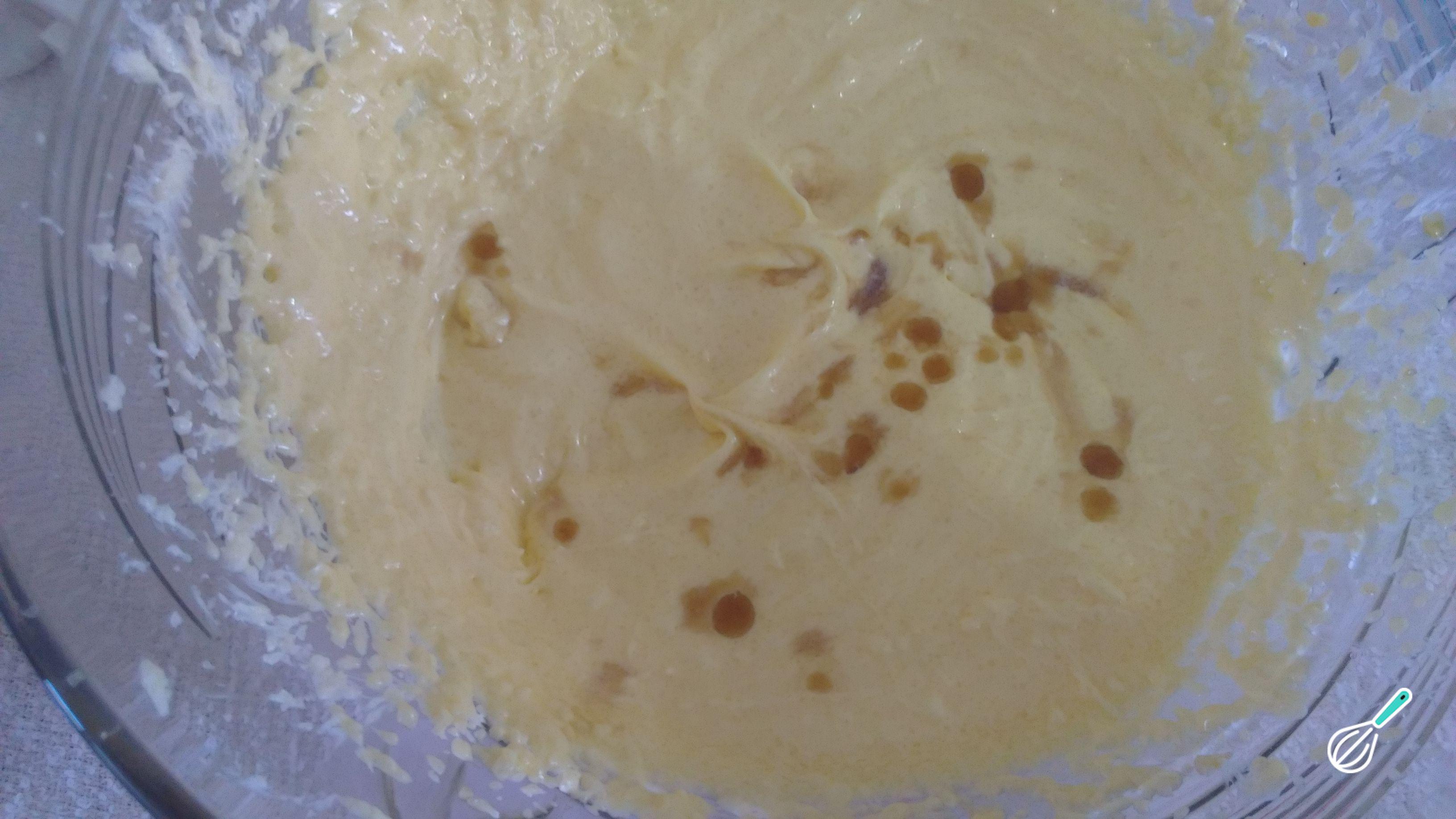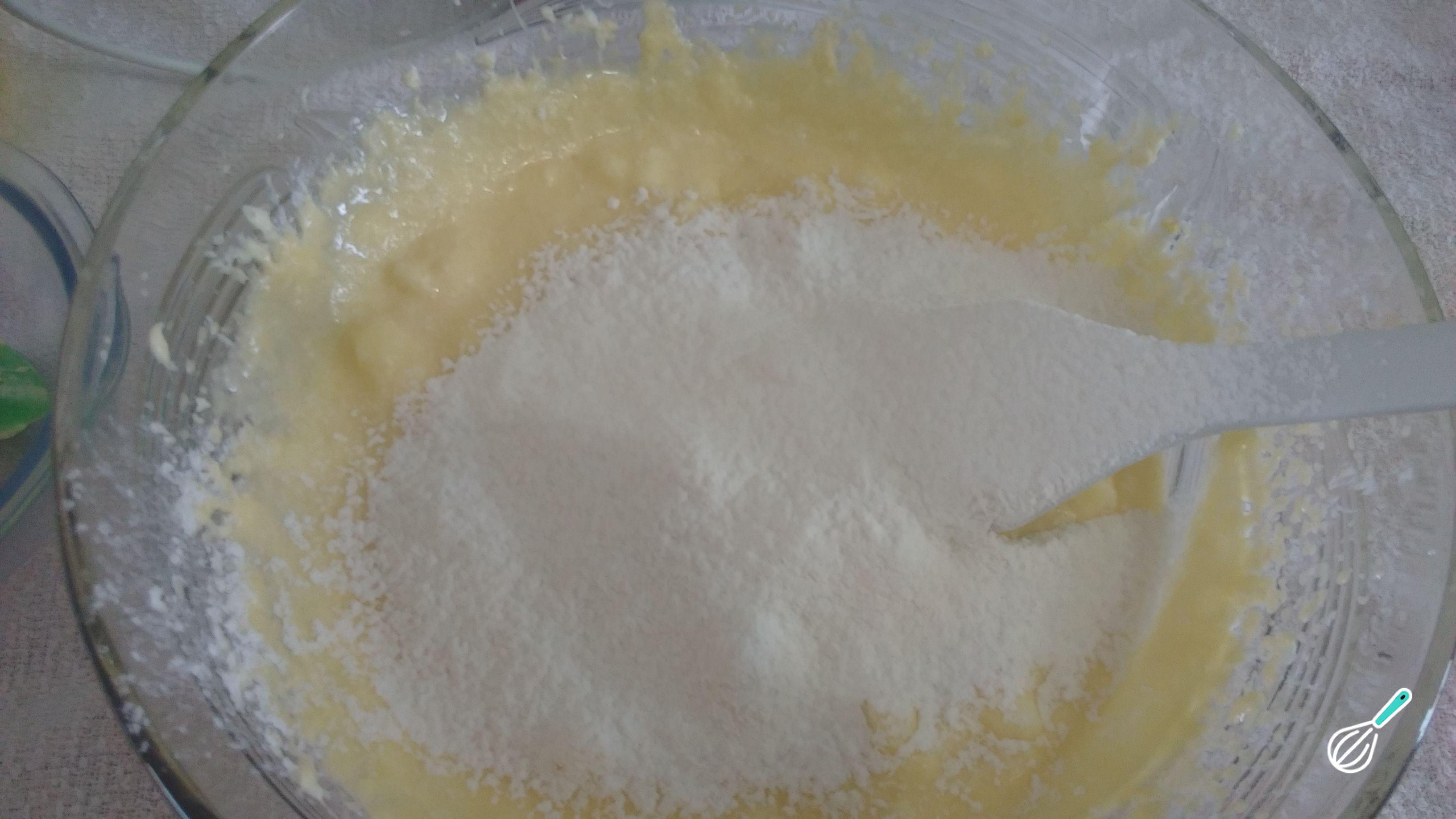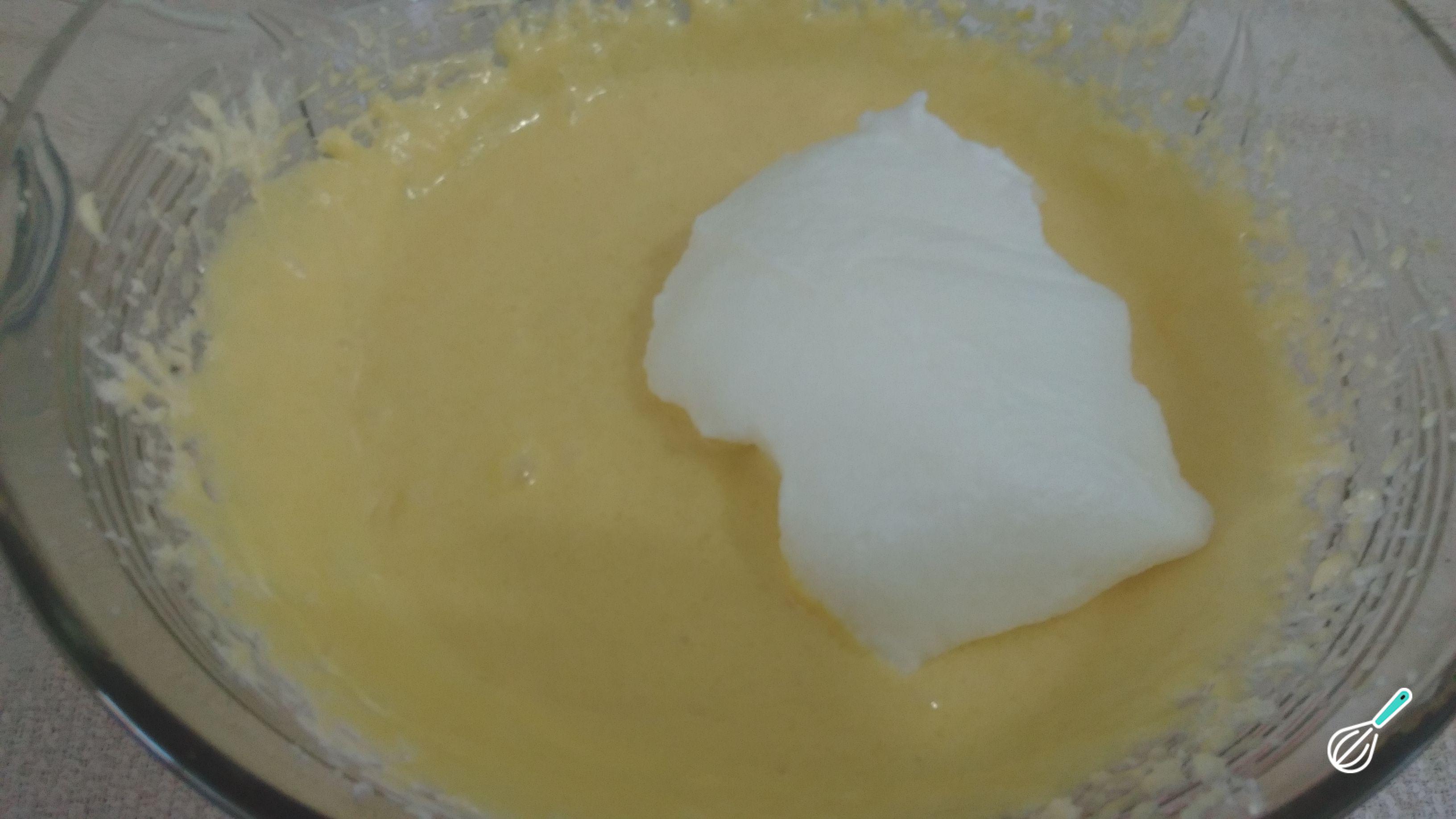 Para adicionar as claras e a farinha à mistura, faça-o alternadamente. Primeiro, adicione um pouco das claras e misture bem de forma delicada.