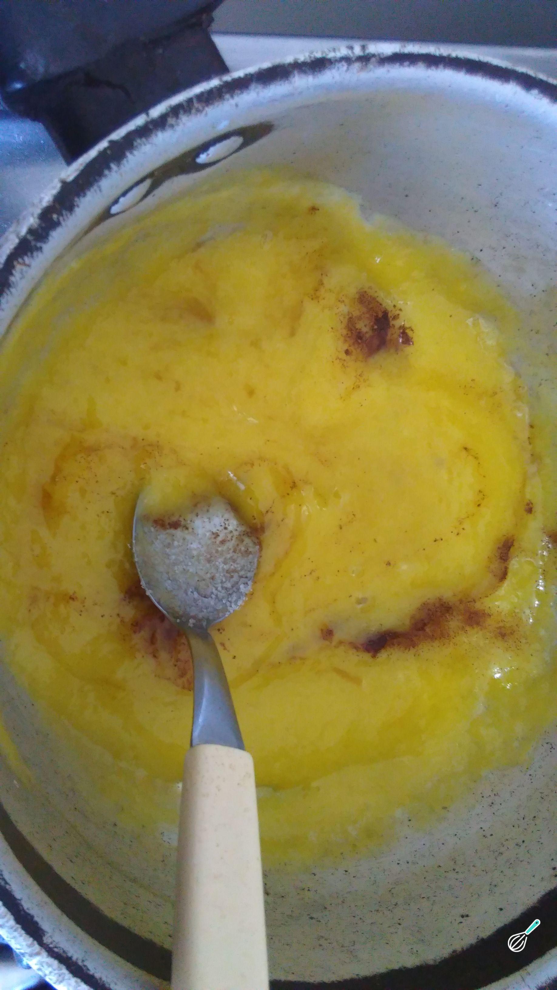 Nós vamos colocar uma calda de manga para aproveitar o sabor delicioso dessa fruta maravilhosa. Para fazer essa calda bata no liquidificador a outra manga, não é necessário coar. Leve ao fogo junto ao açúcar, o creme de leite e a canela. Mexa bem até engrossar um pouco.
