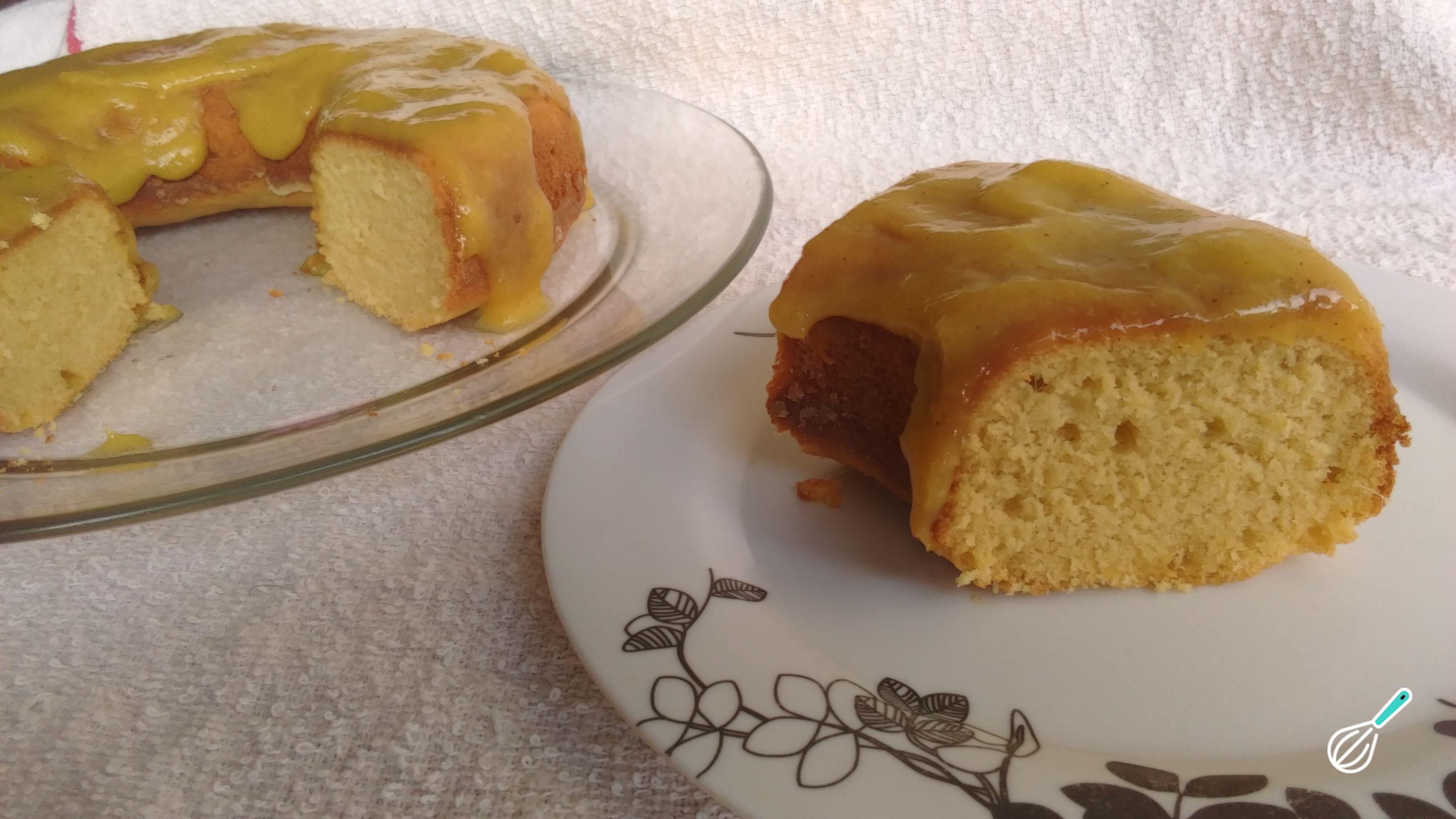 Despeje a calda sobre o bolo de manga, certificando-se de que escorra um pouco para os lados. Sirva e saboreie este delicioso bolo de manga caseiro!
