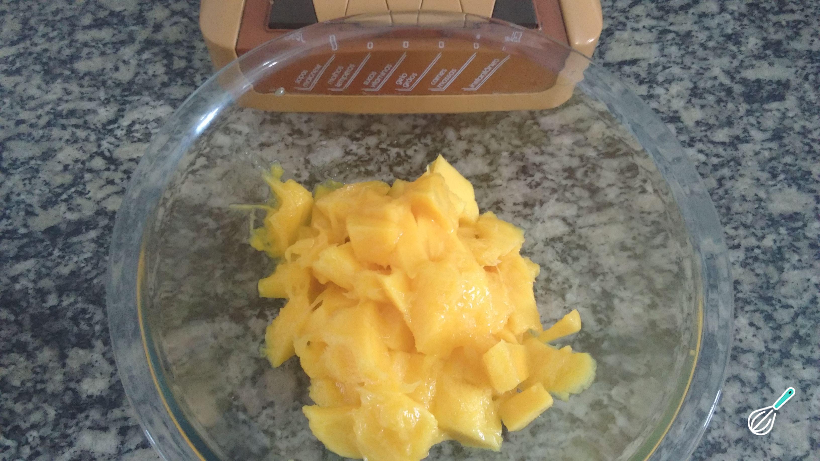 Pique a manga maior em pedaços pequenos e leve ao liquidificador. Misture bem.