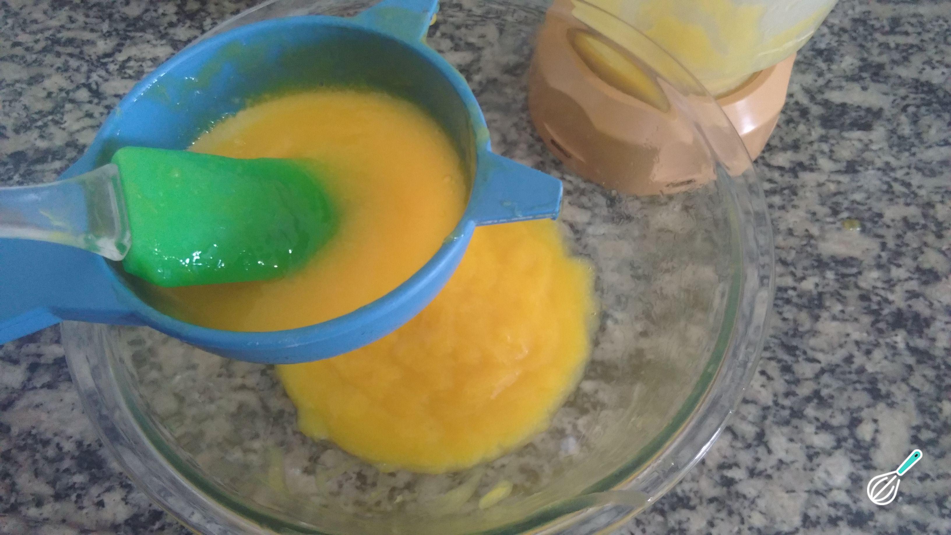 Agora, despeje o suco de manga na mistura e bata muito bem.