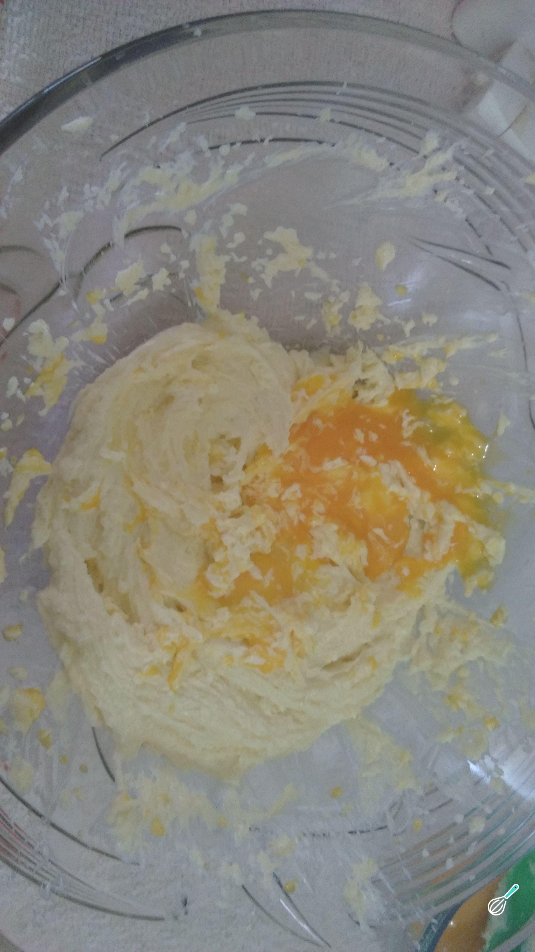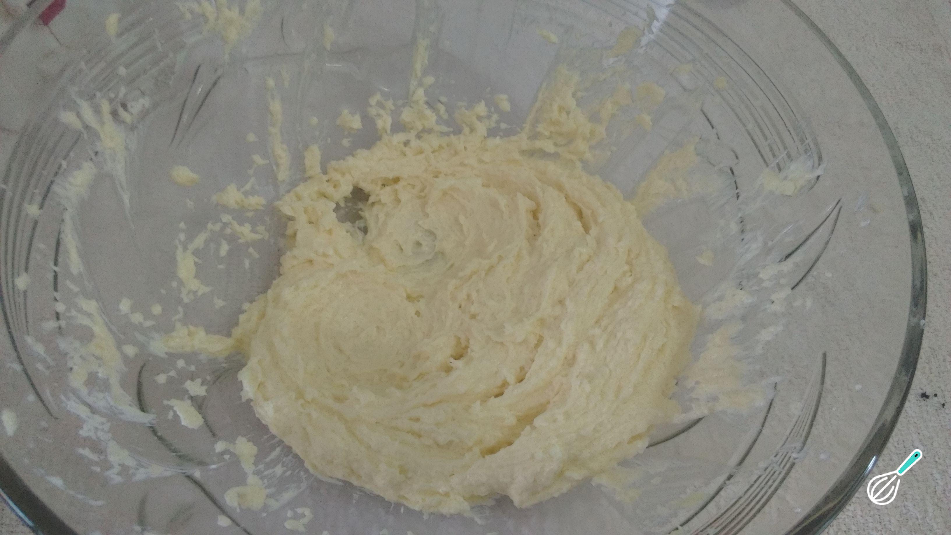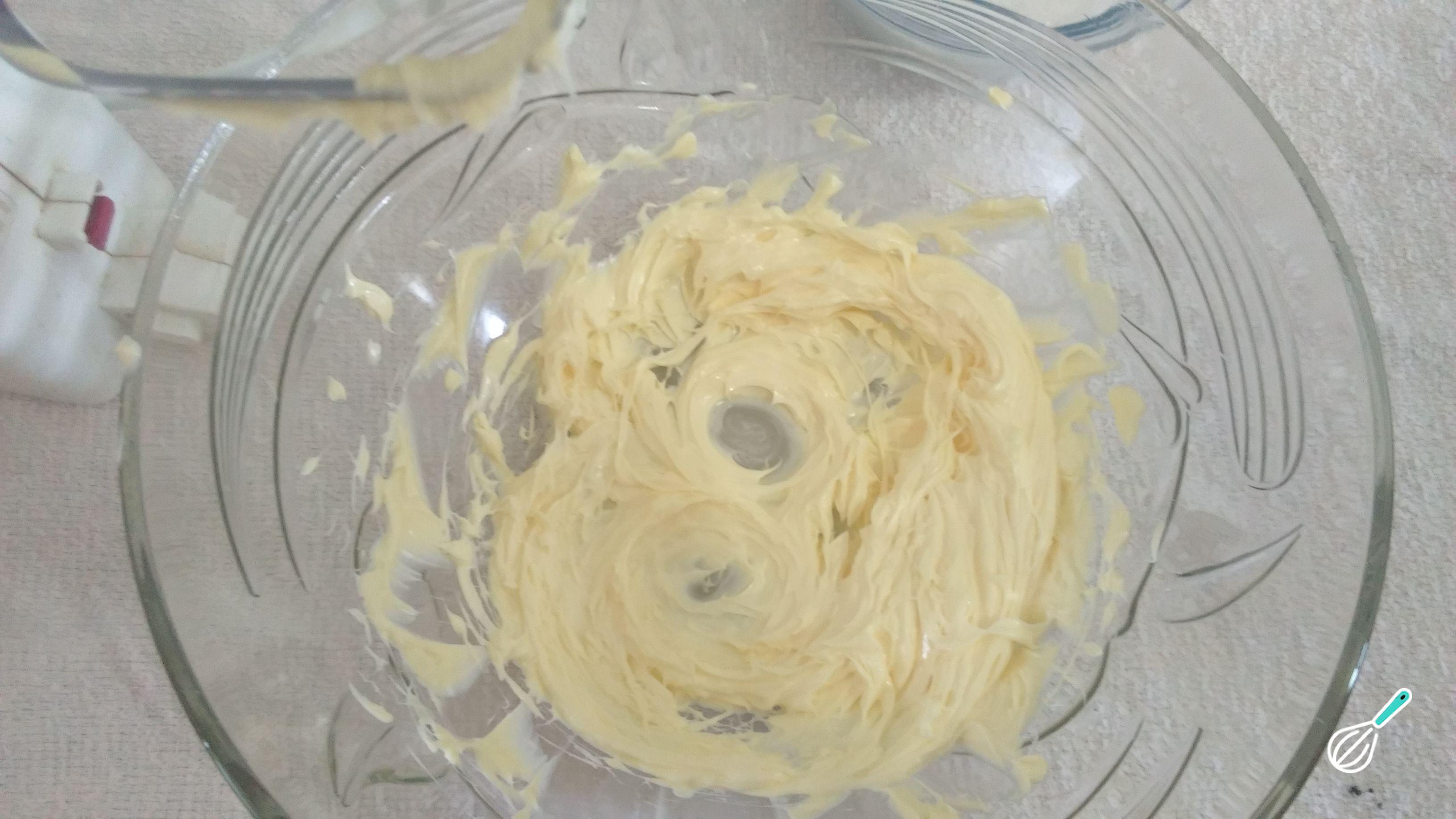 Preaqueça o forno a 180°C. Coloque a manteiga ou margarina em um recipiente e bata na velocidade máxima até ficar completamente homogêneo.
