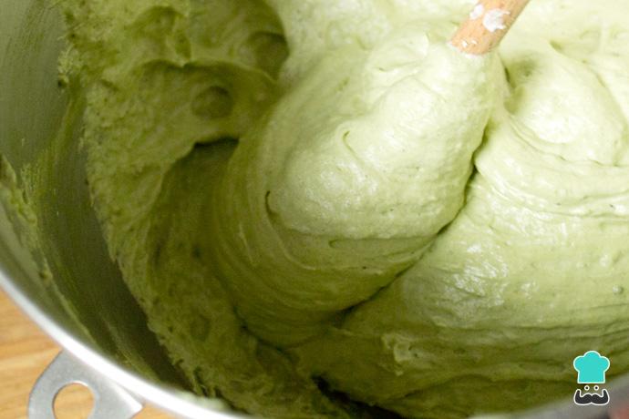 Pouco a pouco, enquanto mistura, acrescente a farinha de trigo à massa do bolo de matcha, intercalando com o creme de leite.