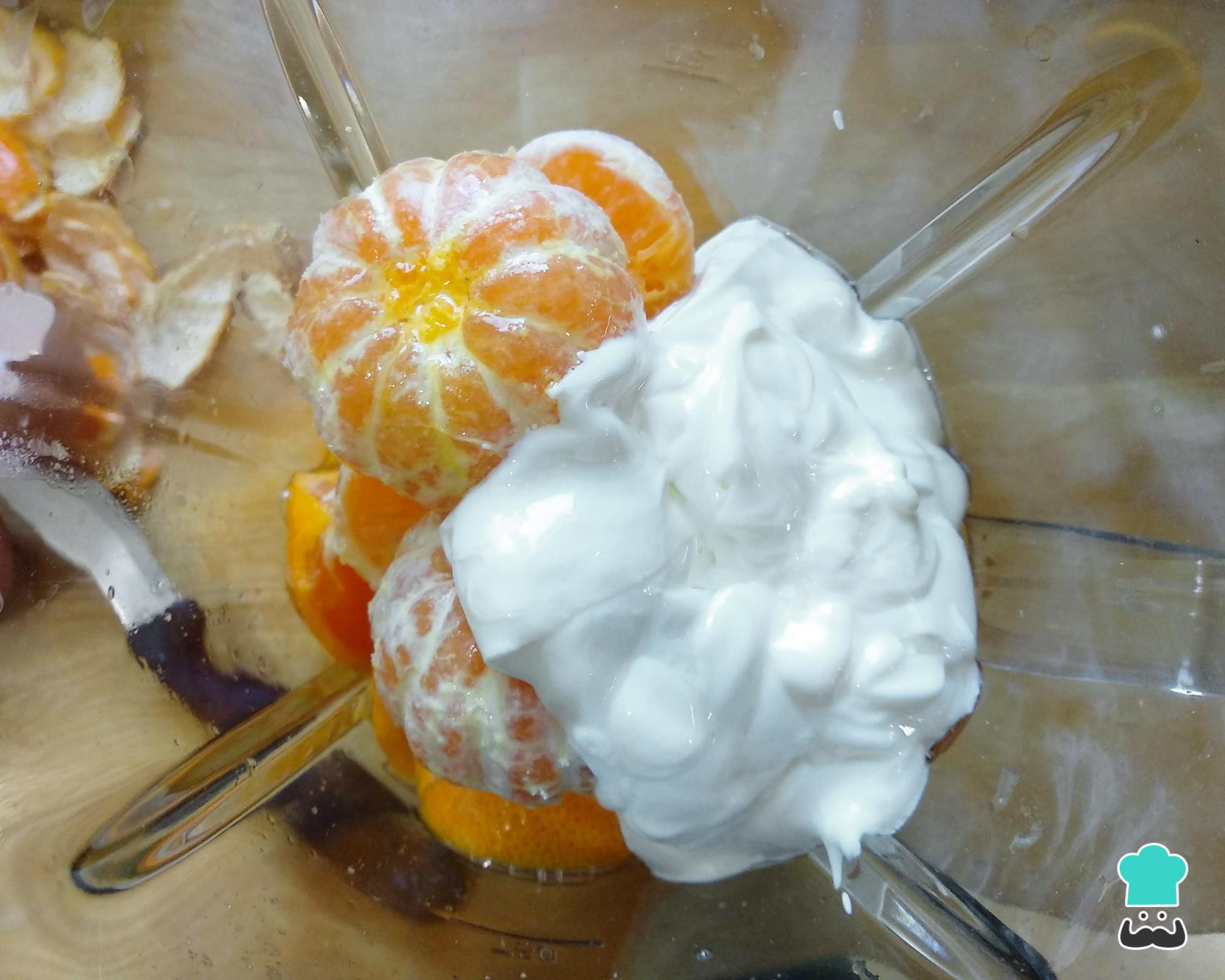 Coloque também no liquidificador as restantes mexericas descascadas, os ovos, o óleo e o iogurte. Bata tudo muito bem por uns 2 minutos.