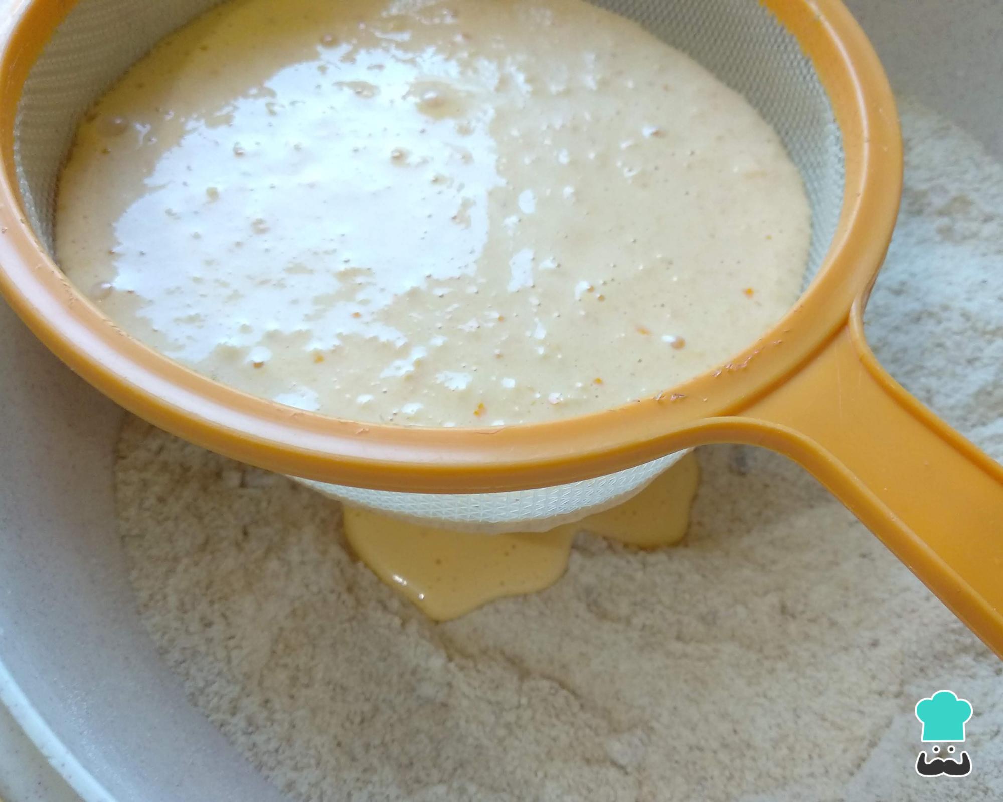 Adicione a mistura do liquidificador através de uma peneira, para filtrar as sementes e pedaços de casca. Misture muito bem até obter uma massa de bolo de mexerica homogênea, junte o fermento e mexa somente até misturar.