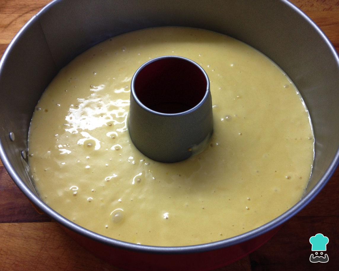 Preaqueça o forno nos 200ºC (forno alto) com calor em cima e em baixo. Unte com óleo ou manteiga uma forma de furo no meio com mais ou menos 22 cm de diâmetro e polvilhe farinha ou açúcar em toda ela. Coloque aí a massa deste bolo de milho.