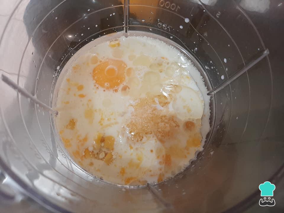 No liquidificador bata os ovos, o milho (drenado), o açúcar, o leite, o óleo e o queijo parmesão por 3 minutos, pelo menos, até que o líquido fique homogêneo.