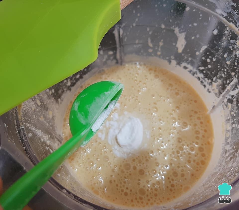Acrescente por último o fermento em pó e misture delicadamente com uma espátula até que incorpore à massa.