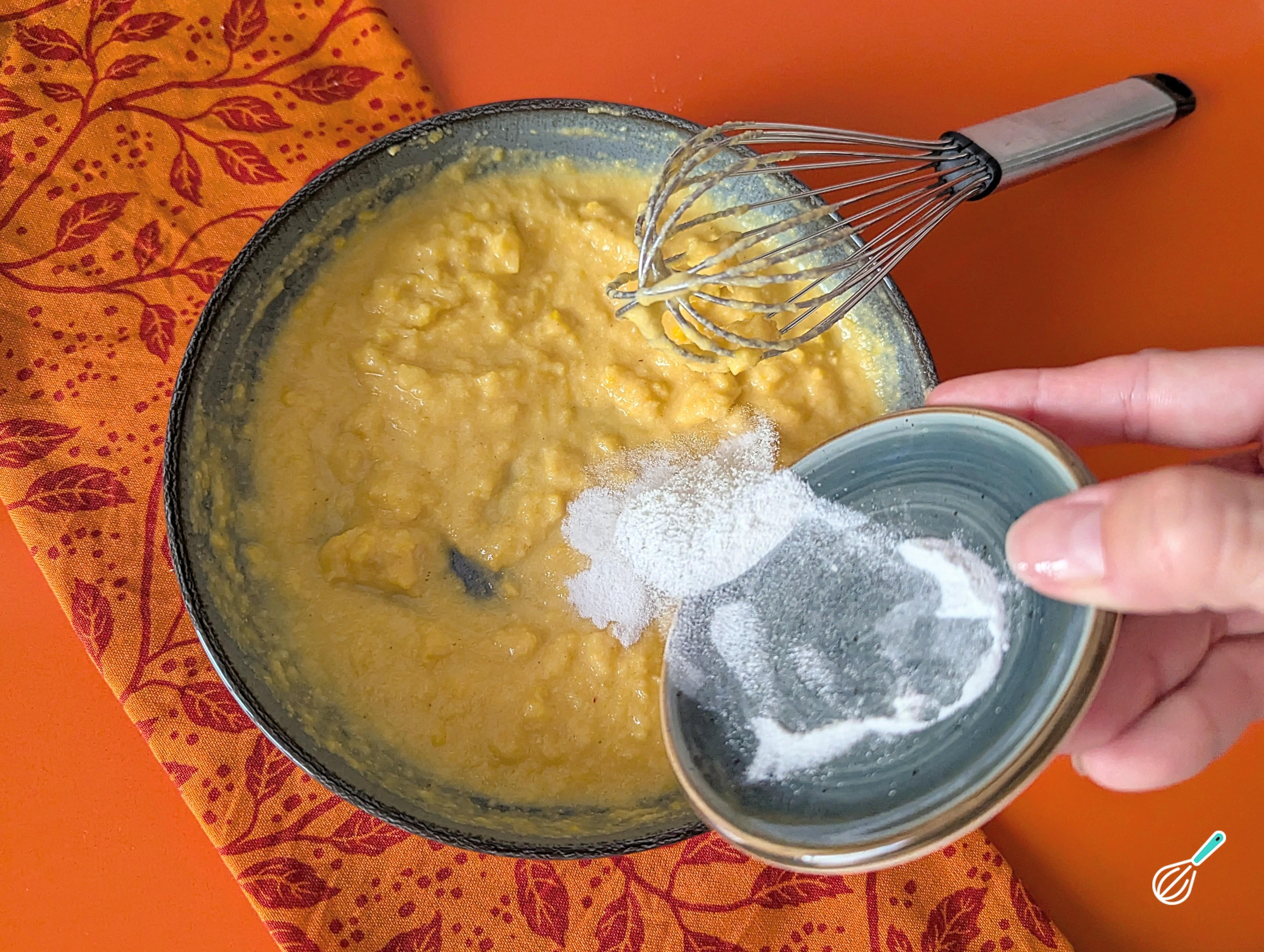 Adicione o fermento em pó e mexa suavemente, somente o necessário até que se incorpore à massa.