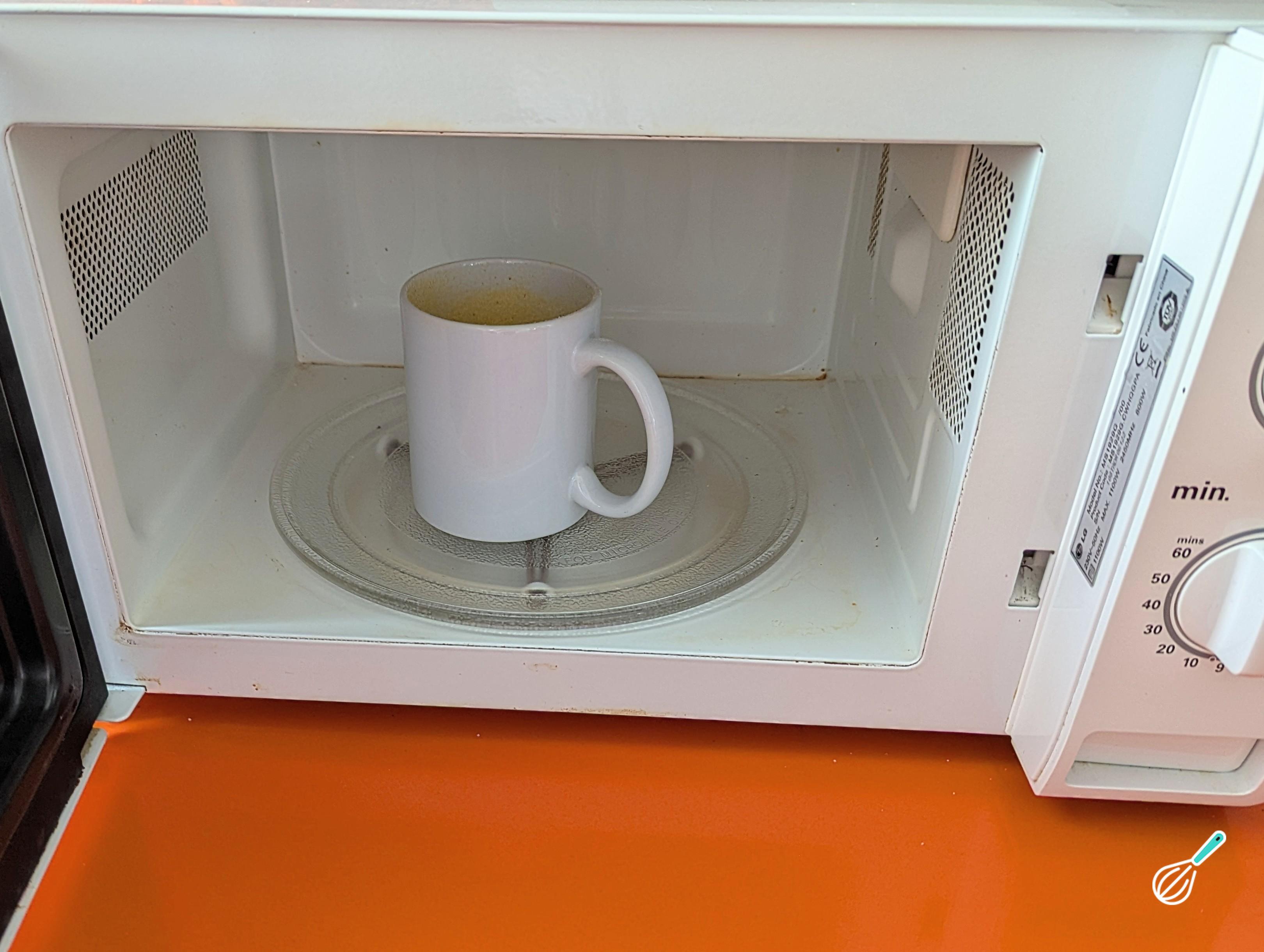 Leve a caneca ao micro-ondas e cozinhe por cerca de 3 minutos em potencia média. O bolo deve crescer e firmar no topo. Faça o teste do palito, se sair limpo, está pronto!