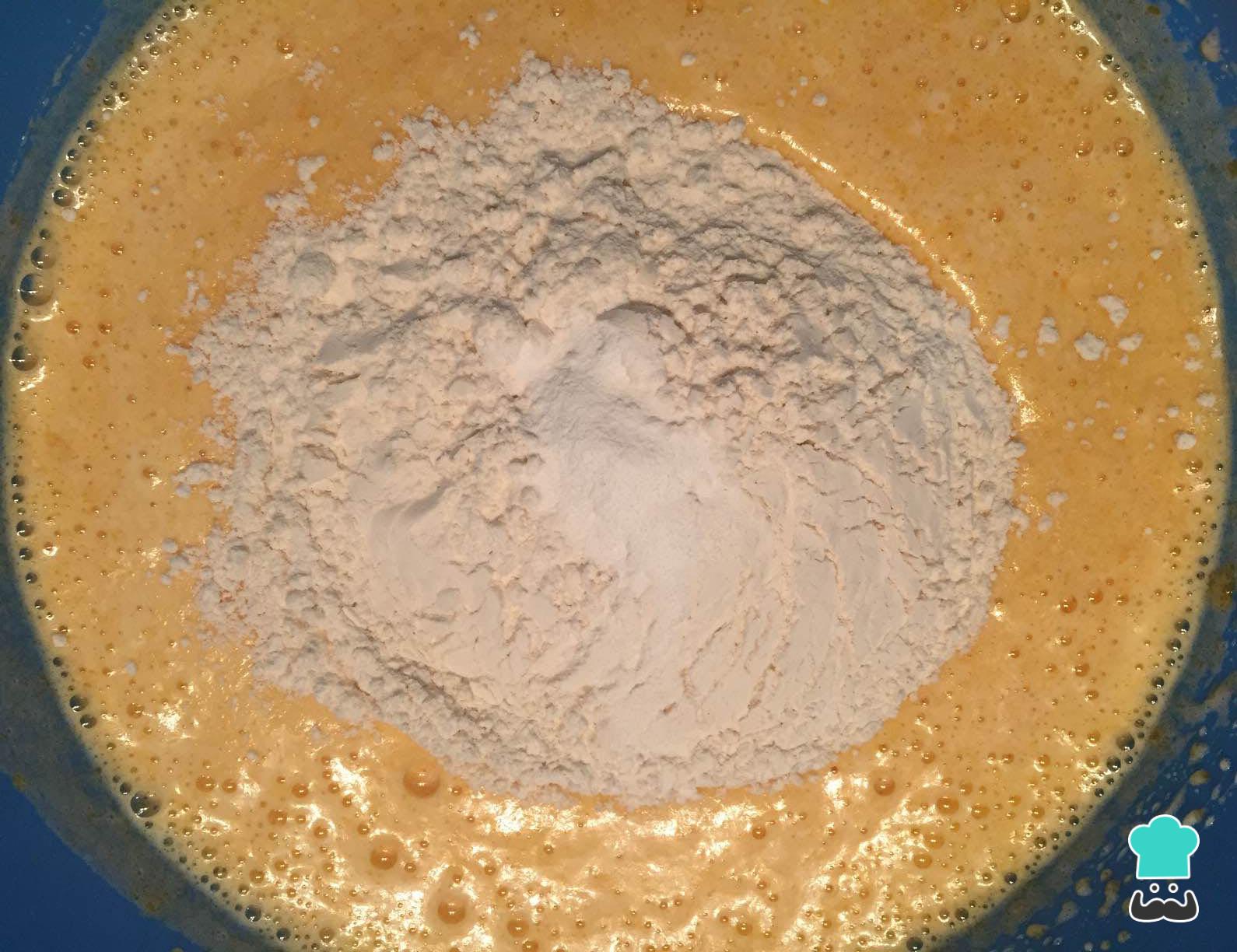 De seguida adicione o fubá, a farinha de trigo, o fermento em pó e misture bem, até obter uma massa lisa e fofinha.