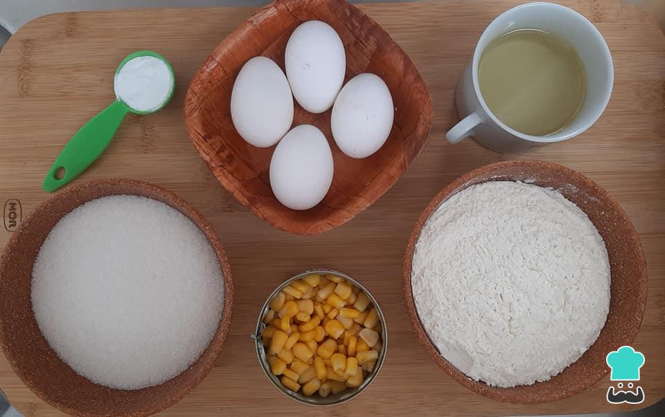 Separe os ingredientes necessários para preparar a receita do bolo de milho caseiro com trigo.