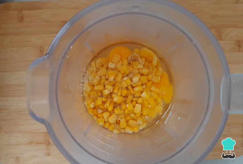 No liquidificador bata o milho (escorrido), os ovos, o óleo e o açúcar até que fique liso e homogêneo.