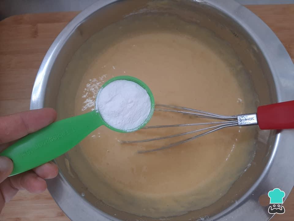 Após isso, adicione o fermento em pó e misture delicadamente com um fouet.