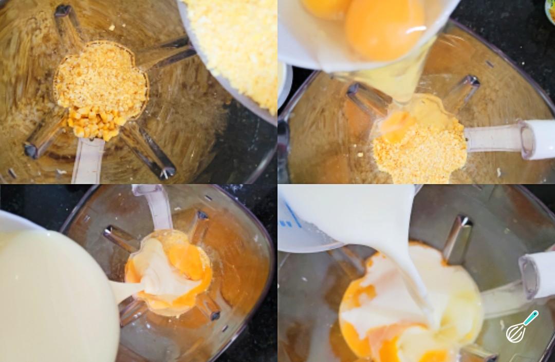 Essa receita de Bolo de milho de latinha com leite condensado é muito prática, por isso, comece colocando todos os ingredientes no liquidificador, exceto o fermento em pó.