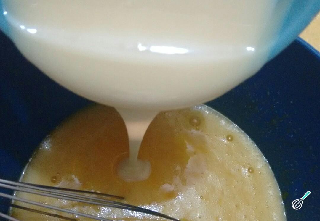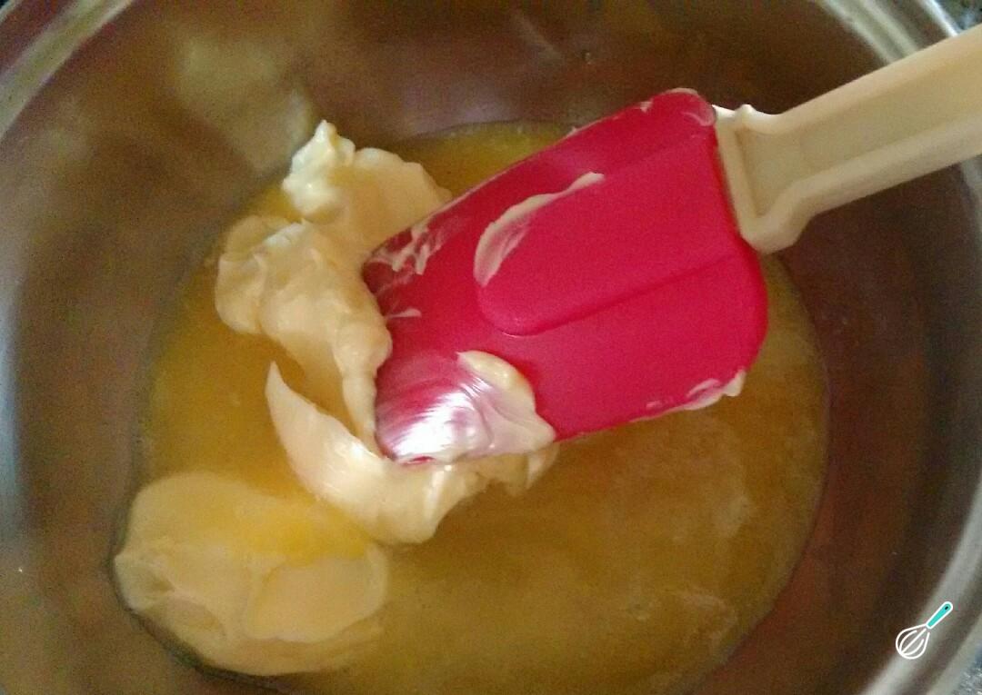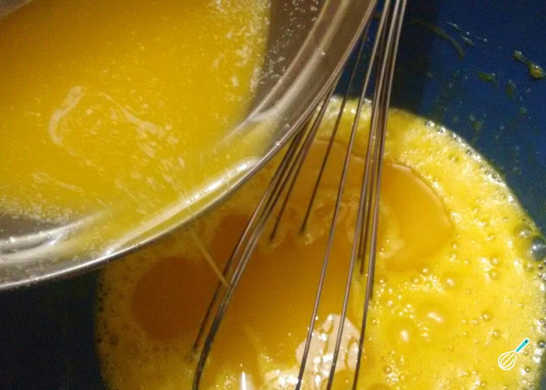 Agora é a vez de adicionar a margarina ao creme de ovos e açúcar, mexendo sem parar.