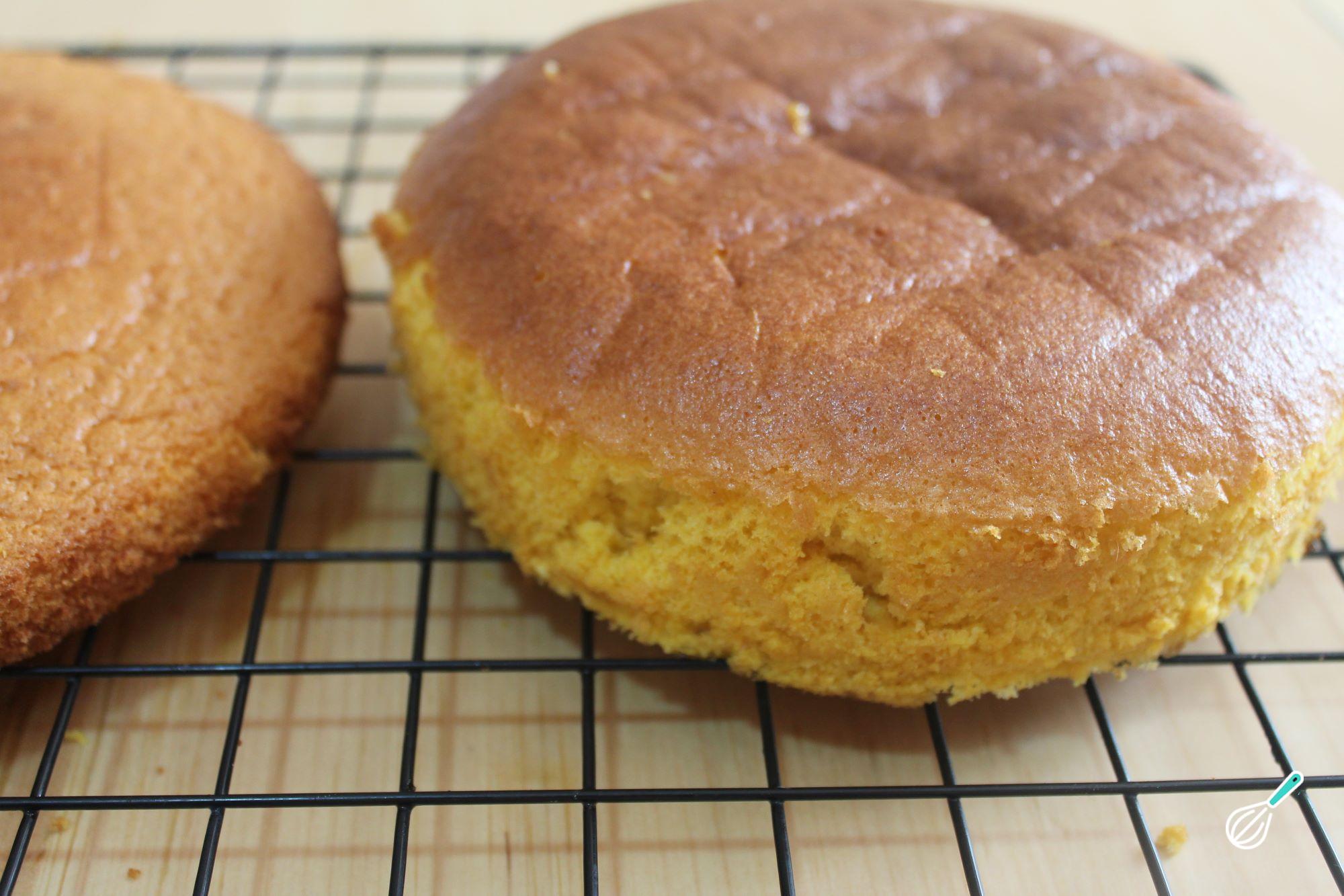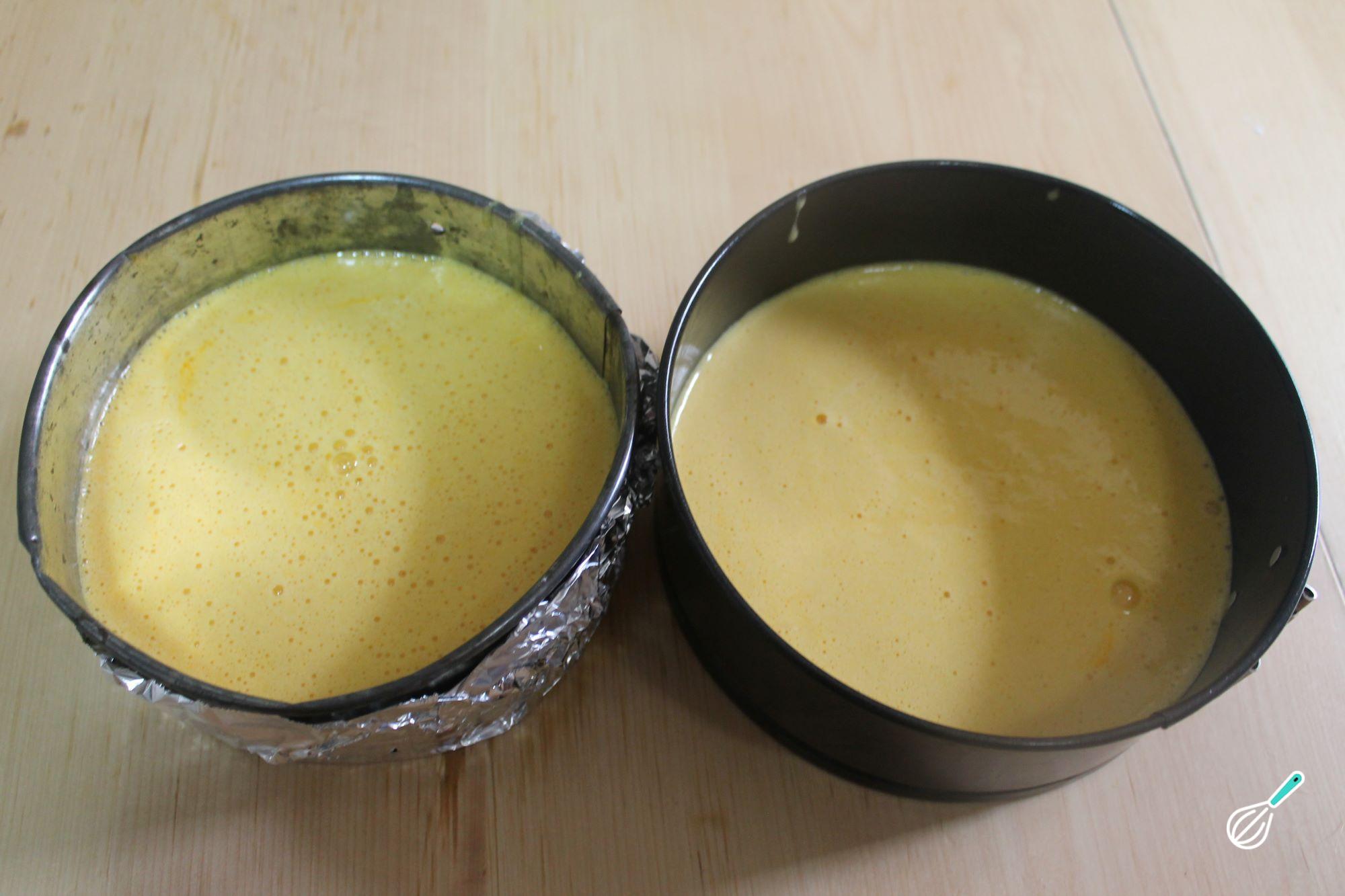 Pré-aqueça o forno a 170°C. Em seguida, unte uma forma redonda removível de cerca de 15 cm de diâmetro e outra do mesmo tamanho ou um pouco maior (não é necessário que sejam iguais). Divida a massa uniformemente nas duas formas. Em seguida, leve ao forno a 170°C com aquecimento em cima e em baixo por 35 minutos. Verifique se está assado espetando com um palito ou com um espeto dentro, porque não deve ter resto de massa crua.