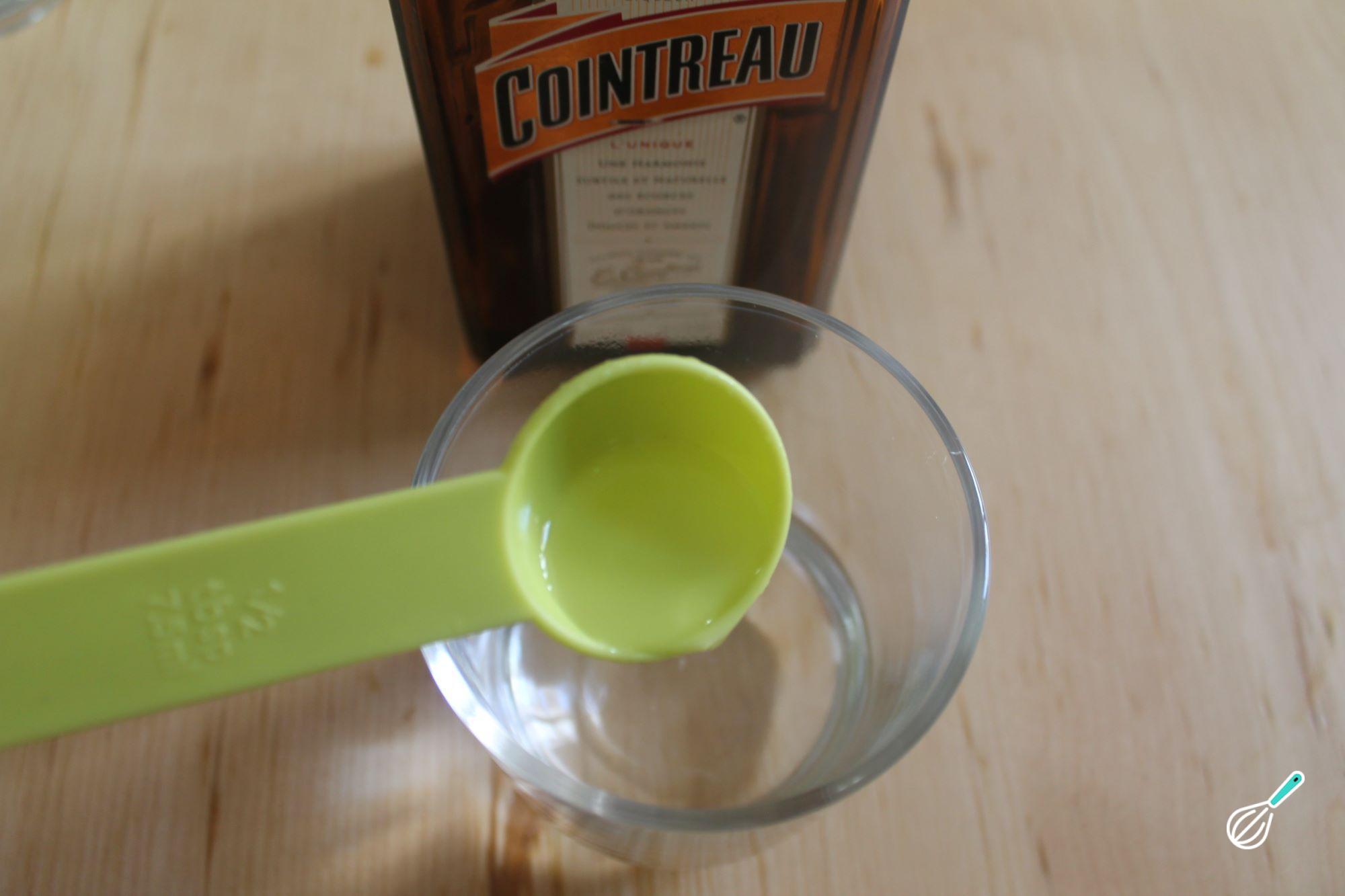 Enquanto isso a massa esfria, prepare a calda caseira. Para isso, misture a água com o açúcar, e deixe ferver. Em seguida, retire do fogo e acrescente o licor Cointreau ou o outro licor de sua preferência. Misture e deixe esfriar.