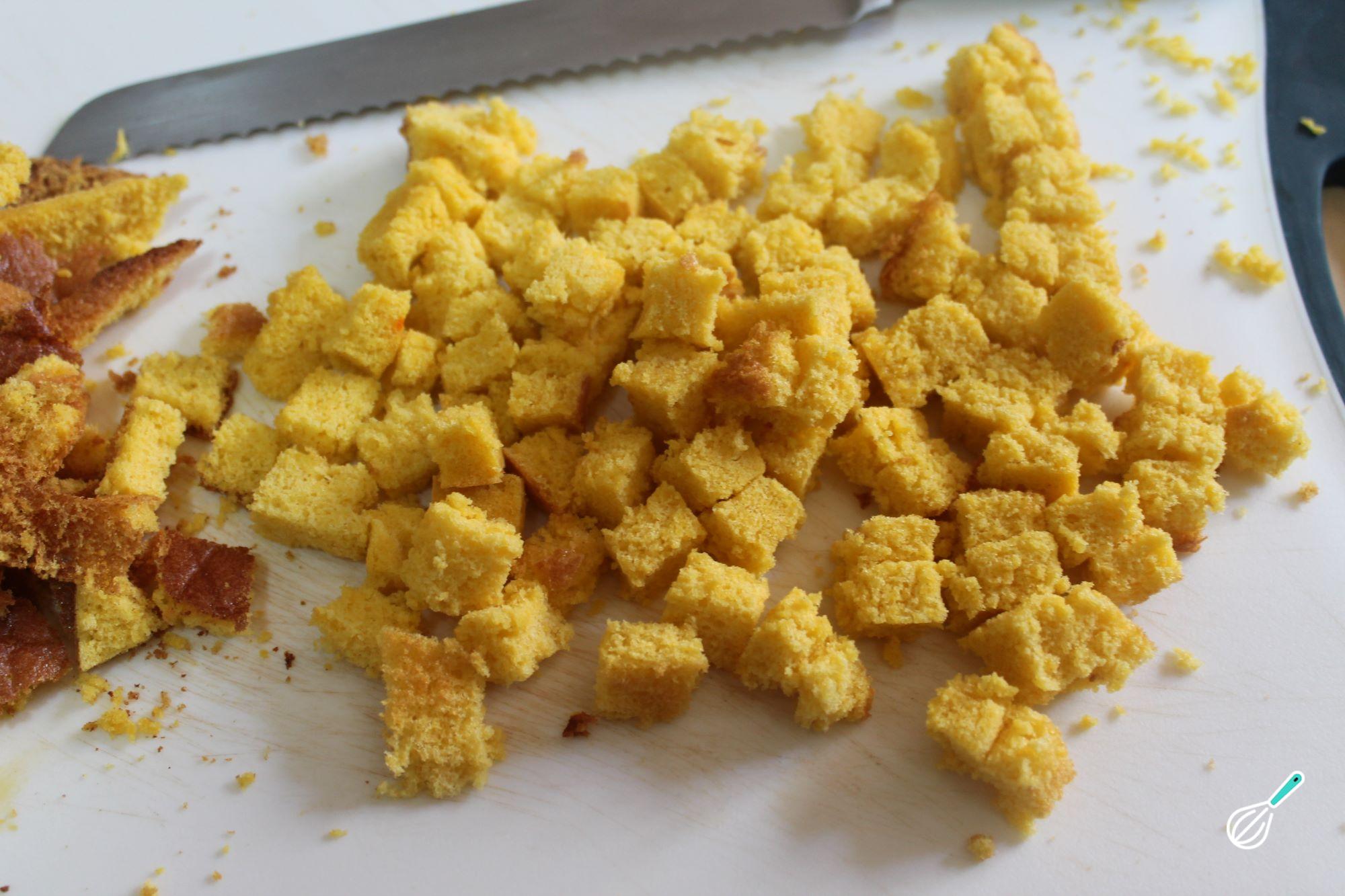 Por fim, continue com a montagem do bolo de mimosa. Para isso, você deve usar o pão de ló de 15 cm para rechear. Corte o outro bolo em pequenos quadrados e retire com uma faca serrilhada, primeiro as bordas mais duras e coradas e, em segundo lugar, corte o bolo em tiras e depois em cubos pequenos. Reserve.