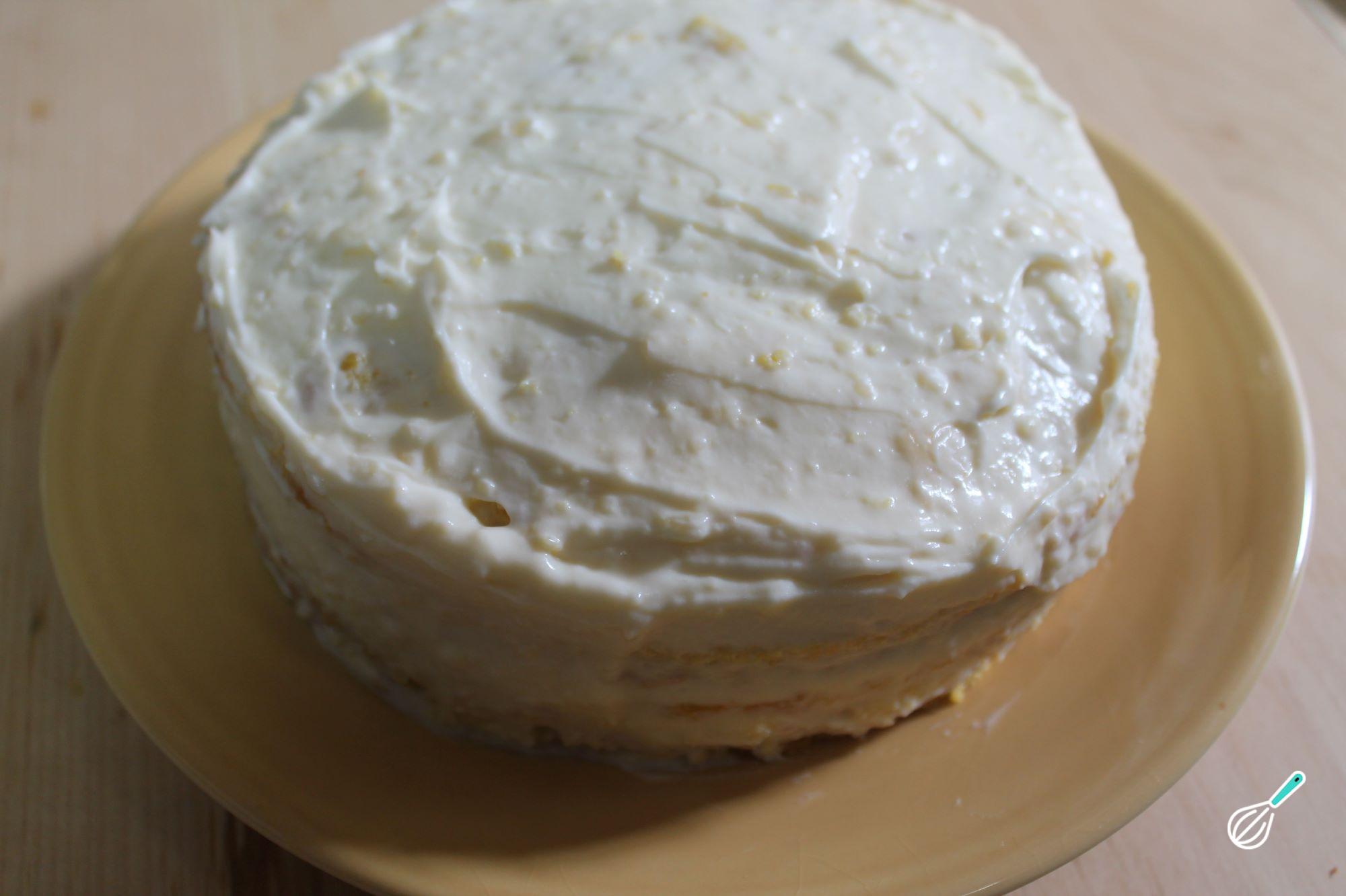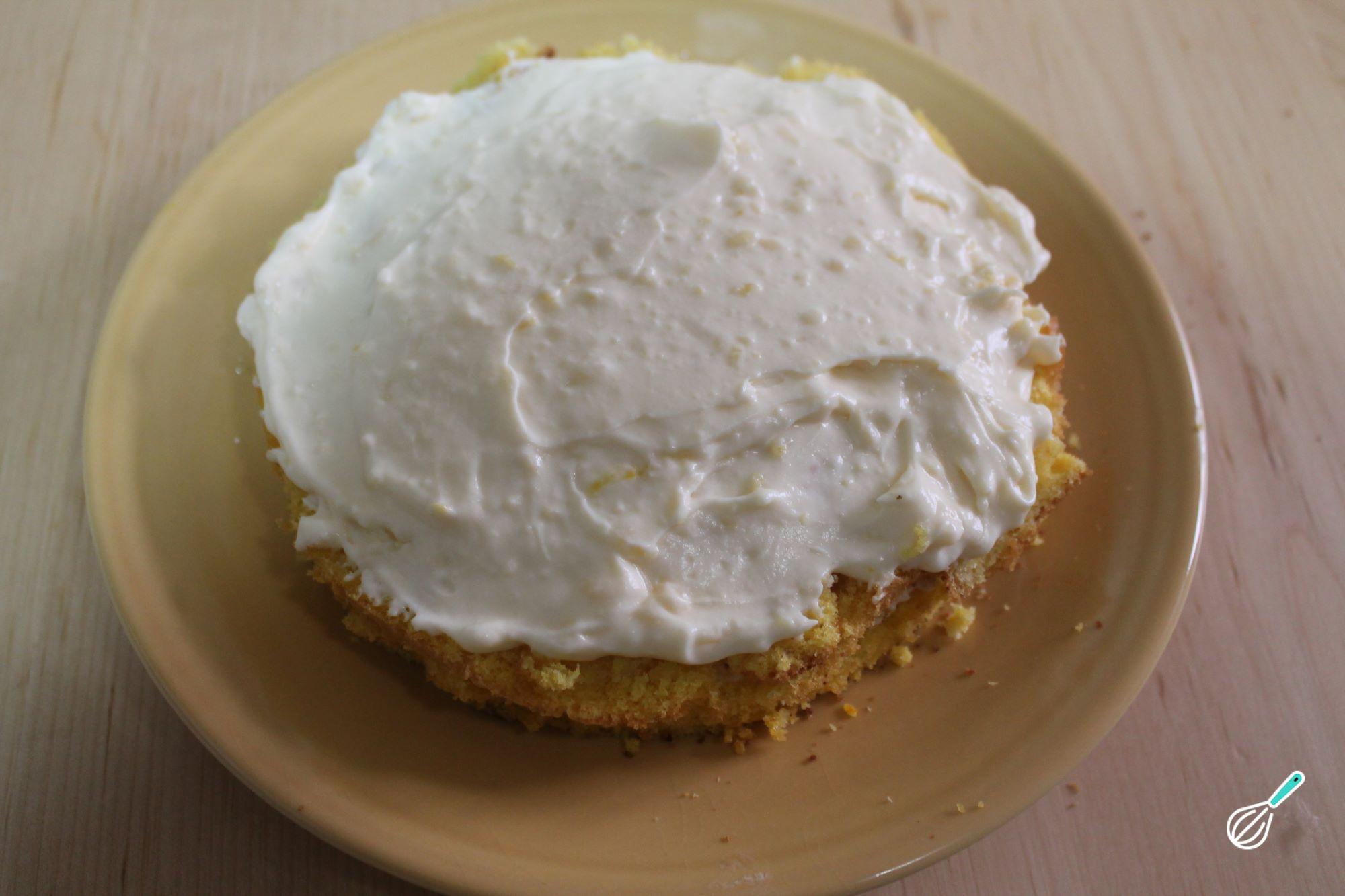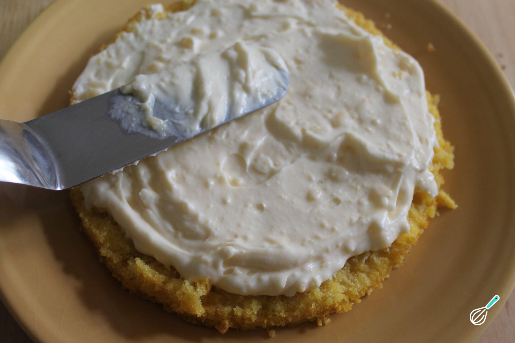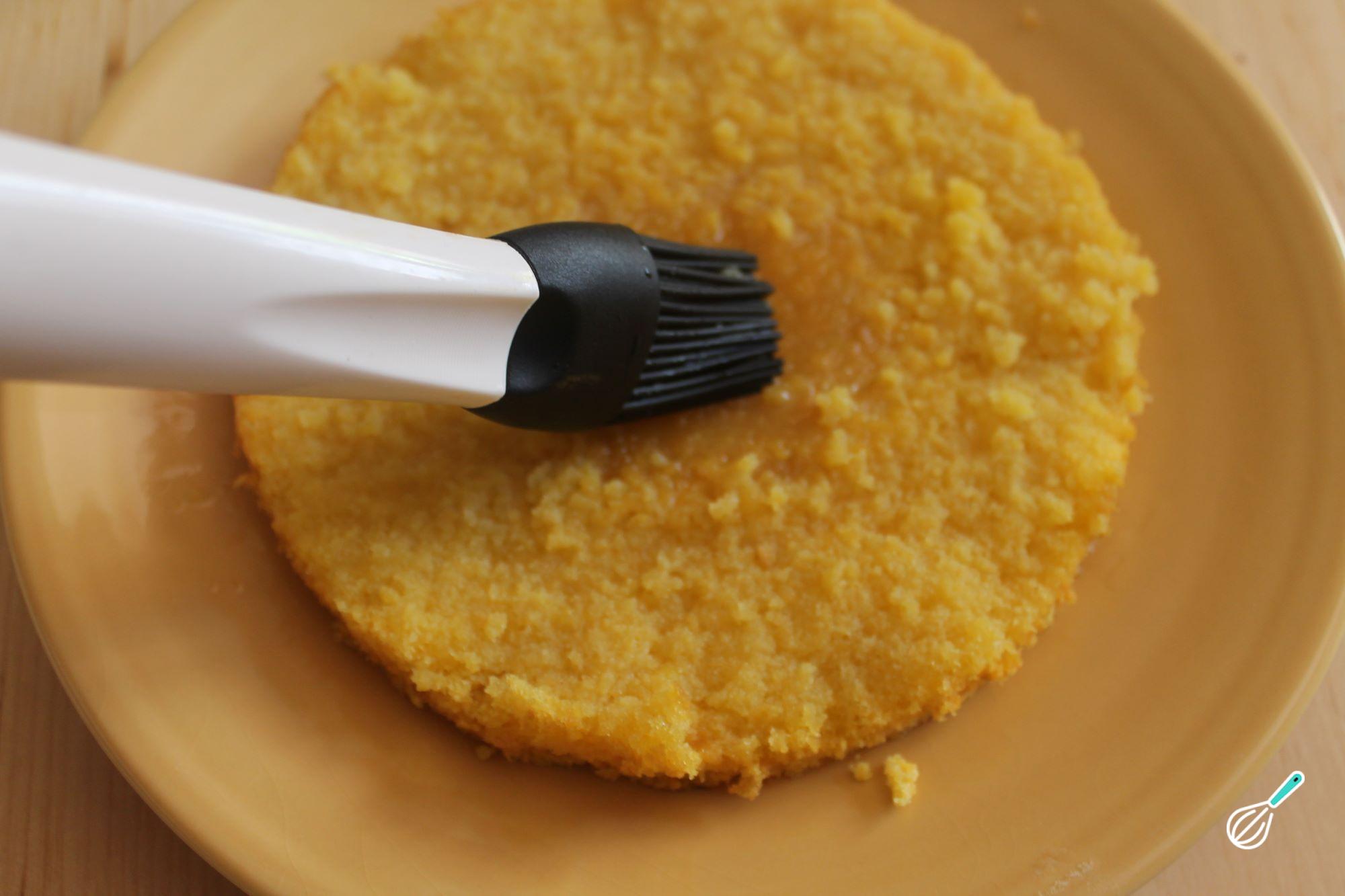 Coloque a última camada de bolo de mimosa e pincele novamente com a calda restante. Dessa vez, cubra todo o bolo com o creme de recheio.