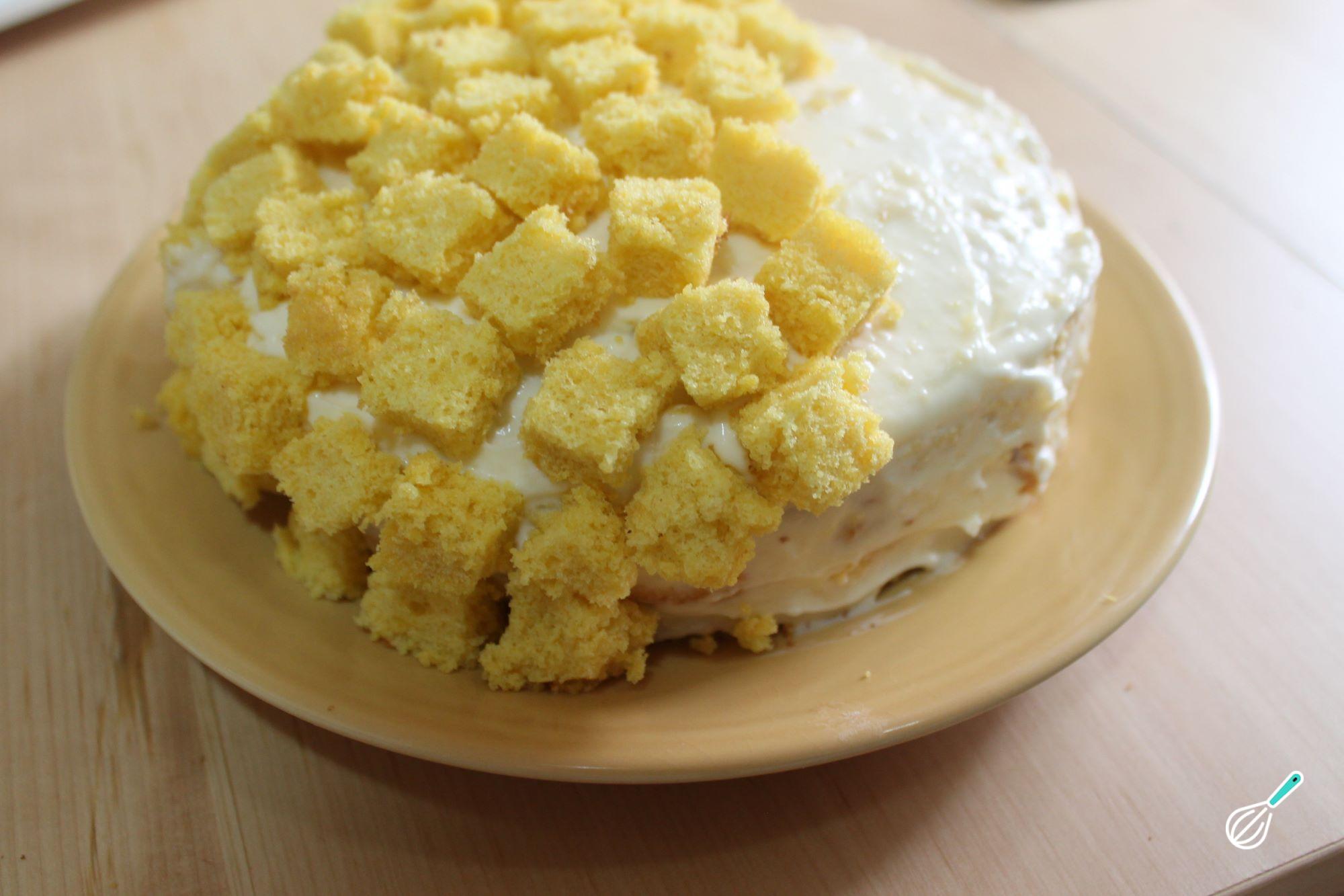 Vá colocando os cubinhos de pão de ló que você reservou para o bolo de mimosa, em volta das paredes até cobri-lo completamente. Pressione um pouco para que os pedaços de bolo fiquem aderidos ao creme.