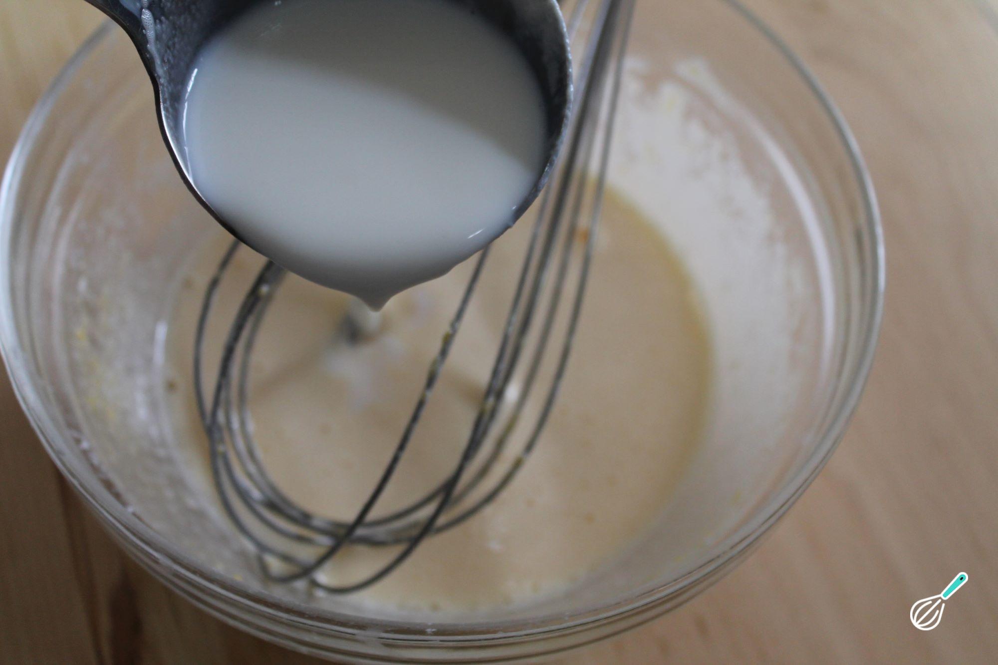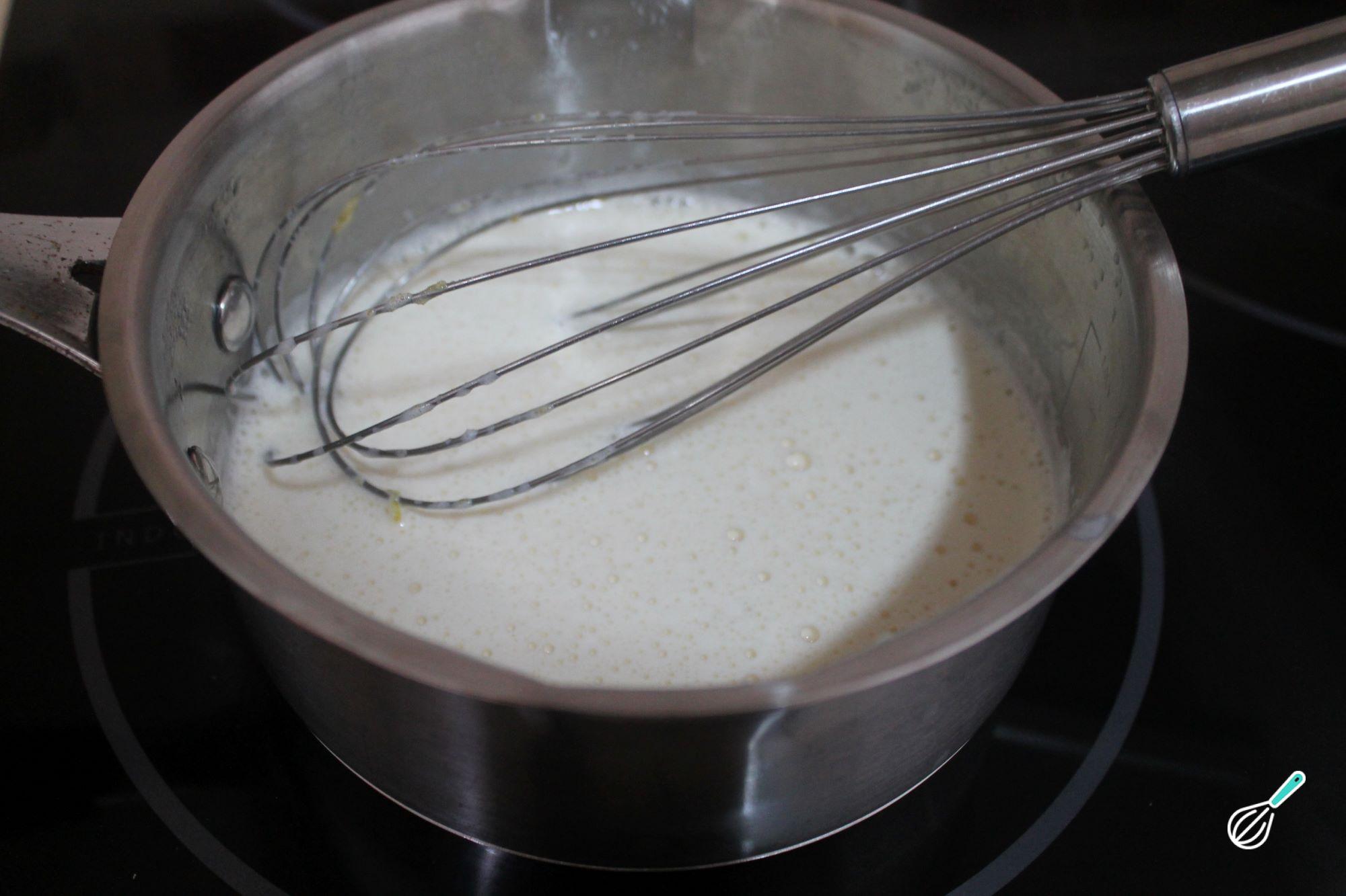 Adicione uma colher de leite à tigela onde você colocou as gemas, o amido de milho e o açúcar. Enquanto isso, bata constantemente para que as gemas não coalhem. Continue adicionando mais leite e siga batendo até acabar tudo.