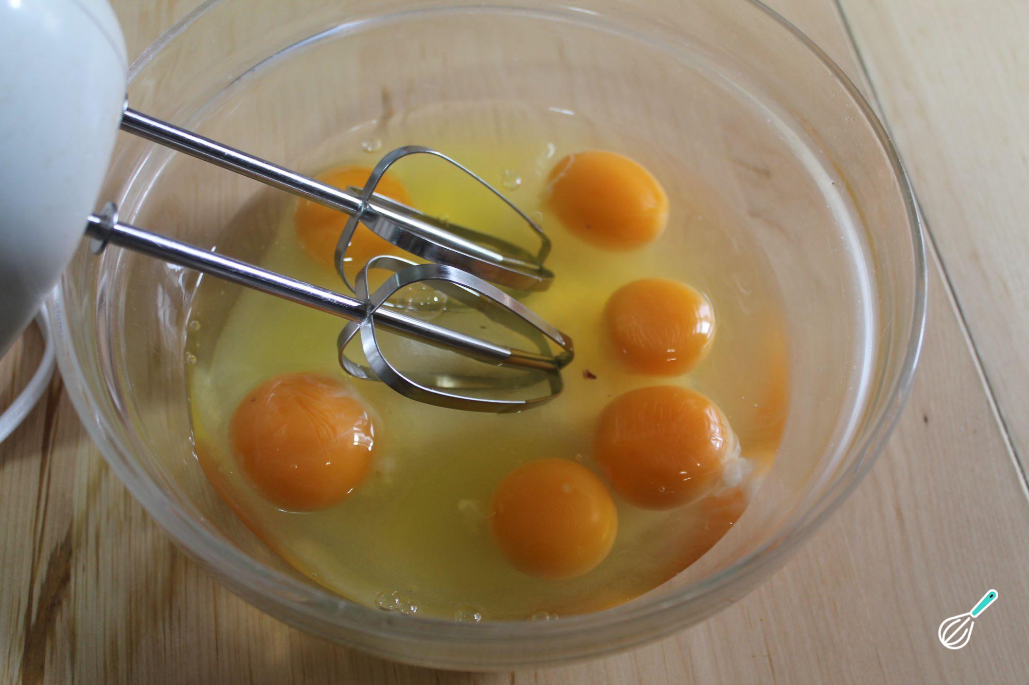 Quando tiver o creme de recheio pronto, prossiga para a preparação da massa do pão de ló de mimosa. Para fazer isso, coloque os ovos junto com o açúcar em uma tigela grande e bata com uma batedeira até as gemas espumarem e ficarem com uma cor esbranquiçada.
